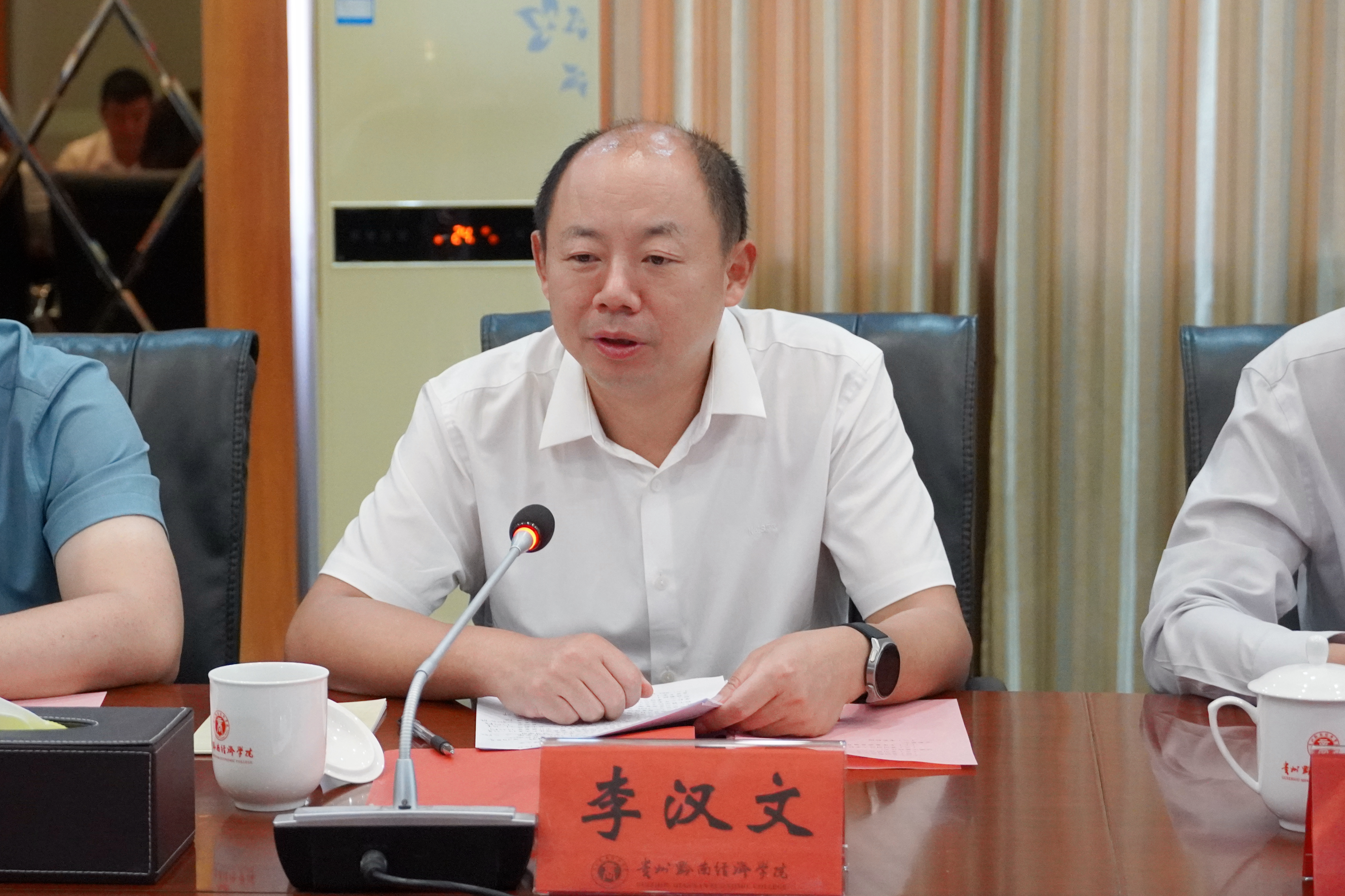 本网讯:(党政办公室(保密办、法律顾问处)于伟咏 图文报道)为进一步落实我校与黔南经济学院的战略合作部署,充分发挥我校学科专业建设优势,探索校校联合培养研究生新模式,共同推动全省高等教育高质量发展。10月17日上午,校长、党委副书记李汉文率队赴黔南经济学院举行联合培养专业学位硕士签约仪式。黔南经济学院党委书记杨大平,党委副书记、校长周游,我校副校长、党委常委杜剑出席签约仪式。签约仪式由黔南经济学院副校长汪上达主持。