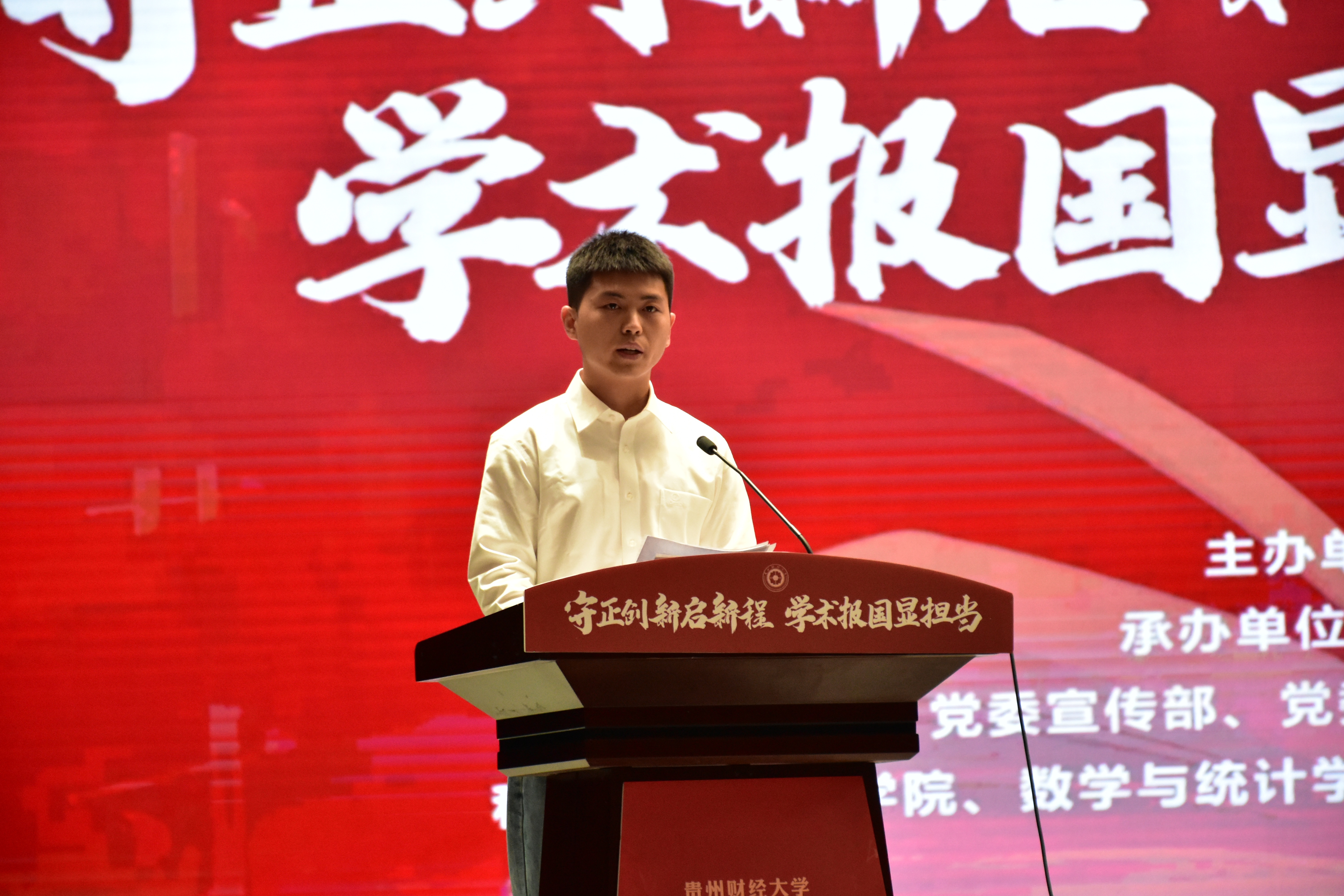 管理科学与工程学院城乡规划学2024级硕士研究生姜国伟同学作为学生代表发言,表达了青年学子主动投身学术对话、果敢探索创新创造的坚定决心与饱满信心,并向全体贵财青年发出倡议,号召大家积极参与到学术文化节的各项活动中,主动走进学术讲座,汲取知识养分;积极参与科研交流,分享研究心得;勇于挑战学术竞赛,突破自我极限。