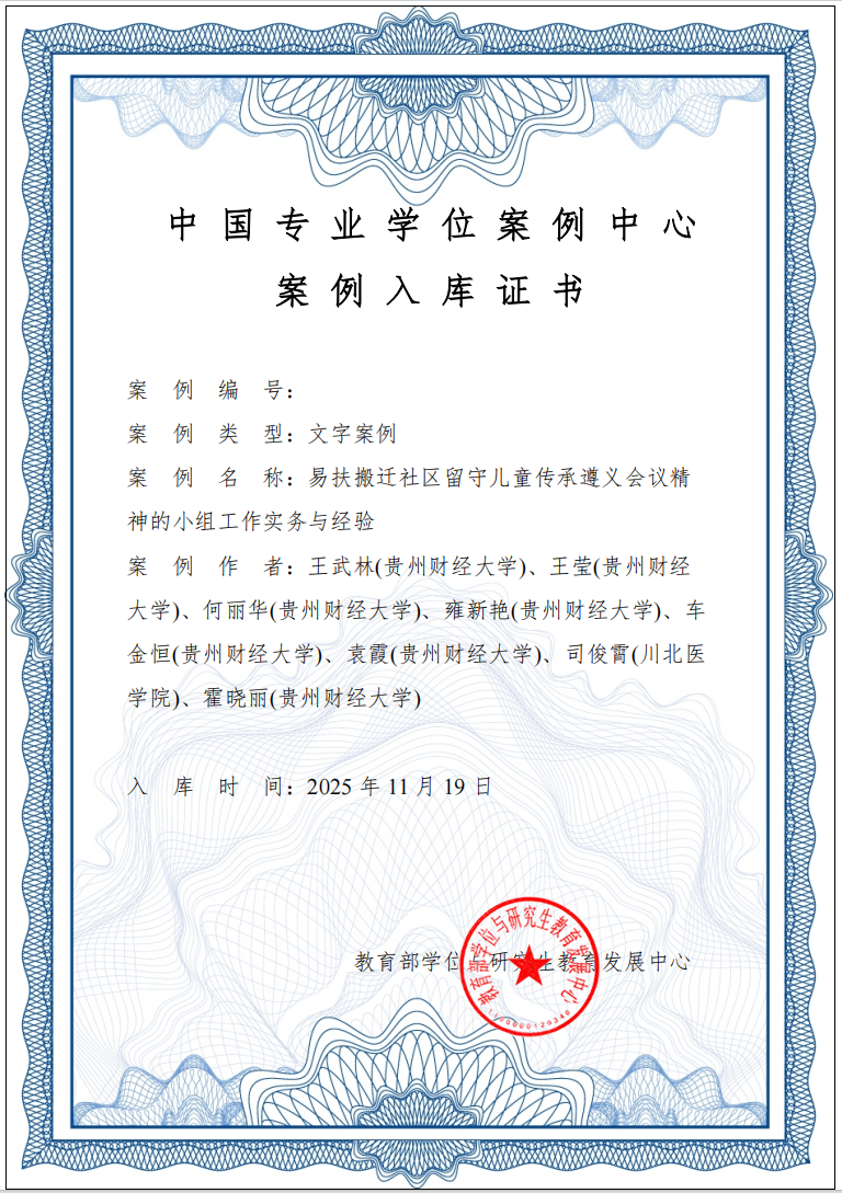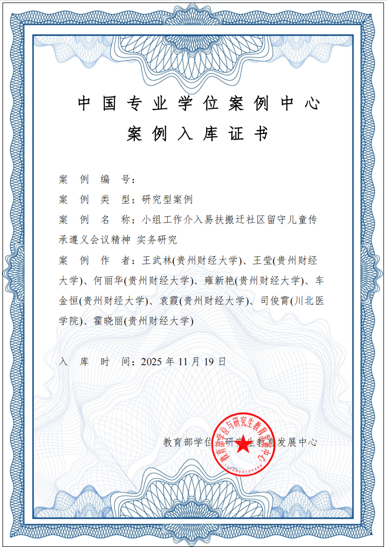 本网讯:(公共管理学院 袁夏 图文报道)近日,公共管理学院社会工作专业领域实践教学与研究取得重要突破。由公共管理学院王武林教授牵头,联合多位专家团队完成的两项专业案例成功入选中国专业学位案例中心,为我校在易地扶贫搬迁社区社会治理与社会工作专业人才培养增添新成绩。