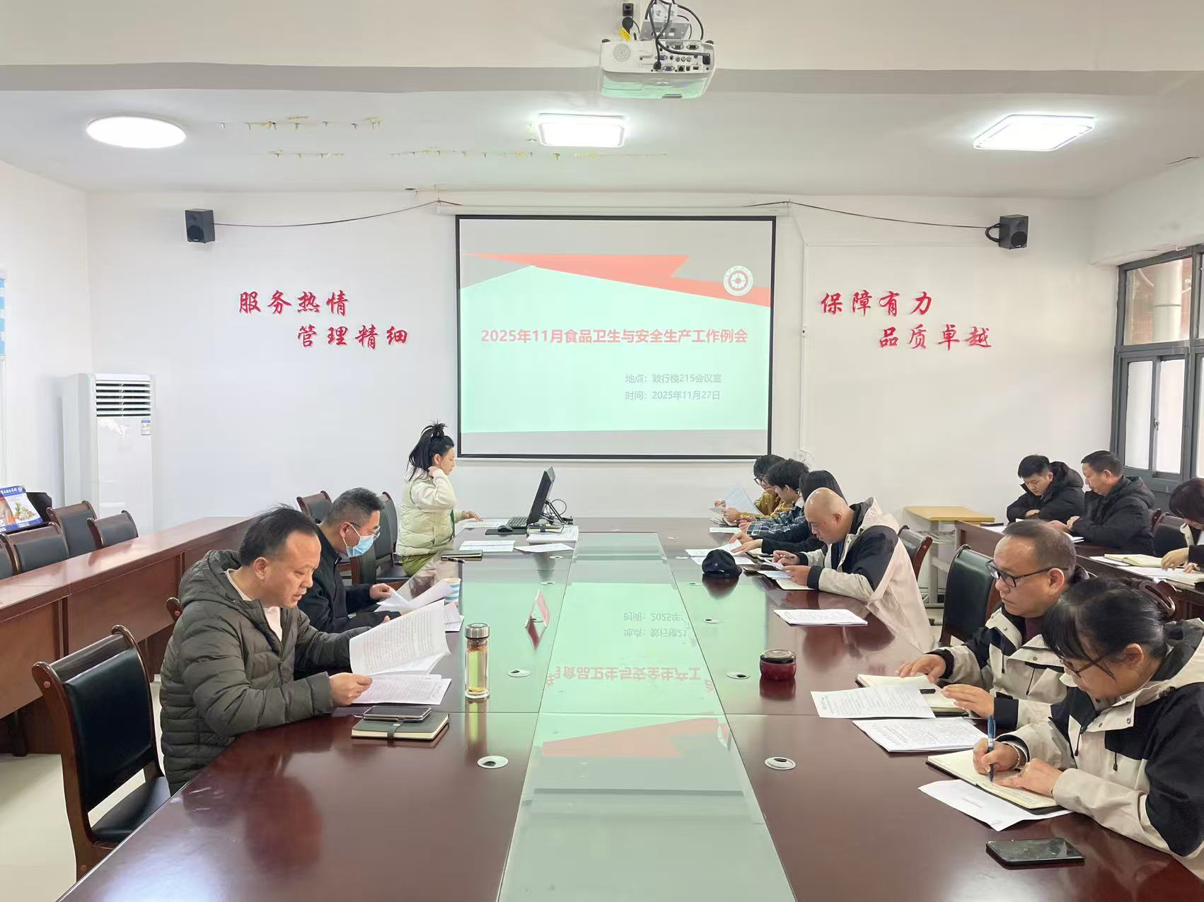 本网讯:(后勤处 易梦洁 报道|摄影 付于洪)为进一步加强校园食品安全管理工作,严防严控校园食品安全风险,11月27日,后勤处在敦行楼215会议室召开11月食品卫生与安全生产例会,后勤处、贵州财大资产经营管理有限公司相关负责人、食品安全总监、食品安全员和其他第三方相关工作人员参加会议。副校长、校党委常委、学校食品安全总监杜剑主持会议。
