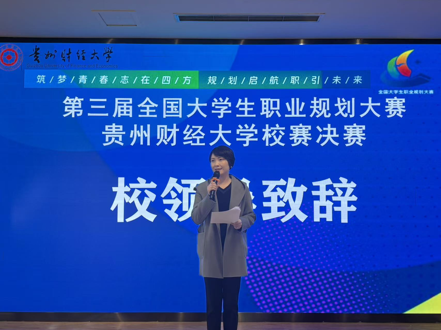 随后,副校长徐艺为大赛致辞。她代表学校党委、行政对莅临现场的评委嘉宾表示欢迎,对辛勤付出的师生表示感谢,并对入围决赛的选手表示祝贺。徐艺指出,职业规划大赛是同学们审视自我、连接未来的重要窗口,是深化高等教育改革、提升人才培养质量的有效途径。她寄语广大同学要胸怀国之大者,在时代浪潮中把准方向,练就过硬本领,在知行合一中厚积薄发,勇于创新突破,在敢闯敢为中开辟新局,将个人理想融入国家发展大局。
