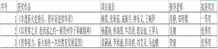 经我校团委选送的《非遗薪火党指引,青年奋进续华章》《以青春之名赴西部之约--展贵州学子奉献精神》《青春接力,薪火相传—共绘教育发展蓝图》的三个作品,在全省193件作品中脱颖而出,荣获佳奖,其中马克思主义学院报送的《非遗薪火党指引,青年奋进续华章》经过现场激烈的角逐斩获本次大赛一等奖。