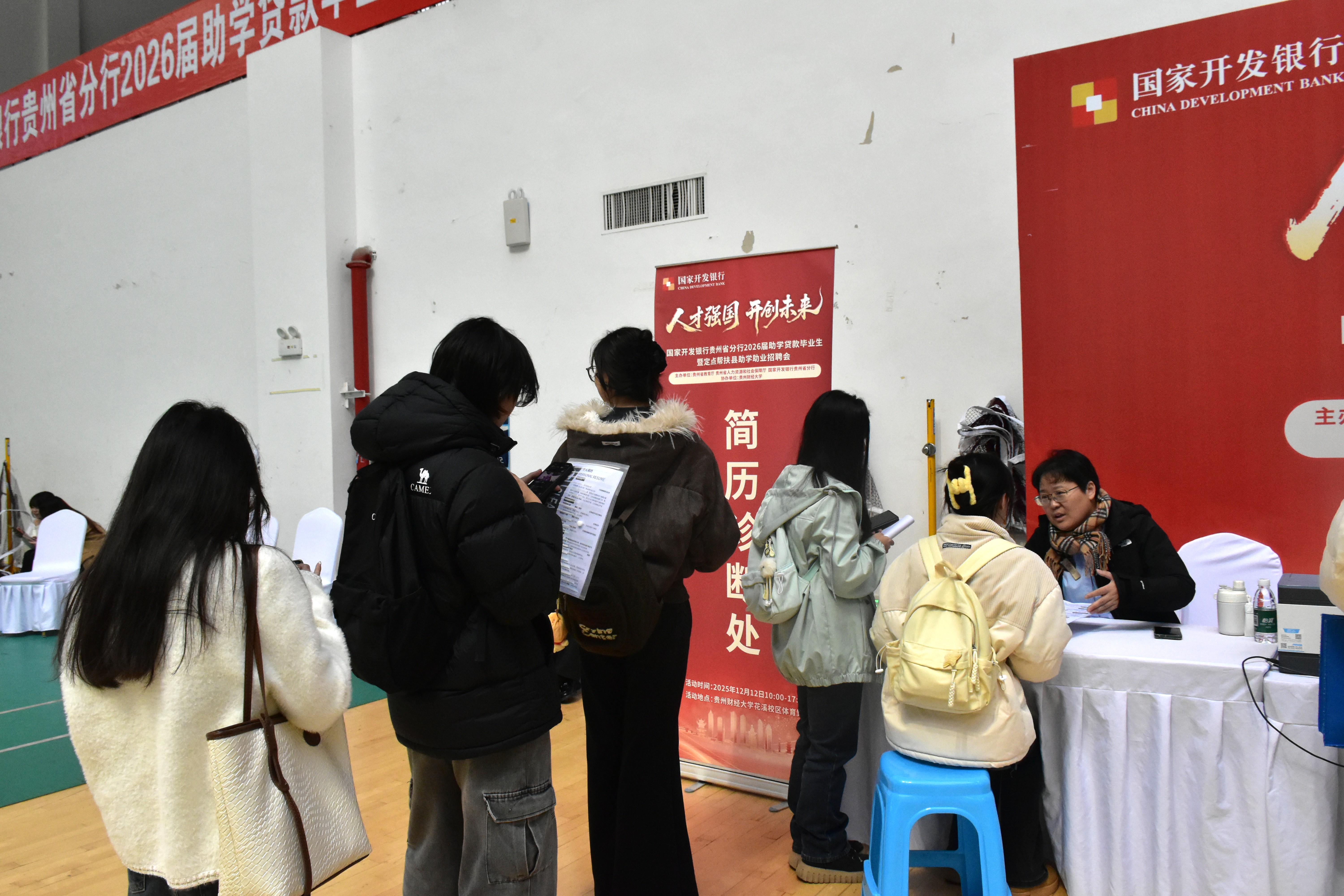 本网讯:(招生就业处 王金 报道|摄影 令狐语嫣)12月12日,由省教育厅、省人力资源和社会保障厅、国家开发银行贵州省分行联合主办,我校承办的“人才强国 开创未来——国家开发银行贵州省分行2026届助学贷款毕业生暨定点帮扶县助学助业招聘会”在我校西区体育馆成功举办。省教育厅督学(副厅长级)江疆,省人力资源社会保障厅党组成员、副厅长肖震,国家开发银行贵州省分行党委委员、副行长王光,我校副校长、党委常委徐艺等出席开幕式并致辞。