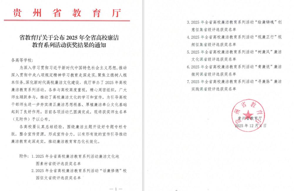 本网讯:(机关党委 杨晓华 报道)在2025年全省高校廉洁教育系列活动中,我校师生参赛作品凭借深刻的主题立意、独特的创意表达及良好的综合效果,在全省众多参赛单位中脱颖而出,荣获一等奖3项、二等奖6项、三等奖13项、优秀奖17项。