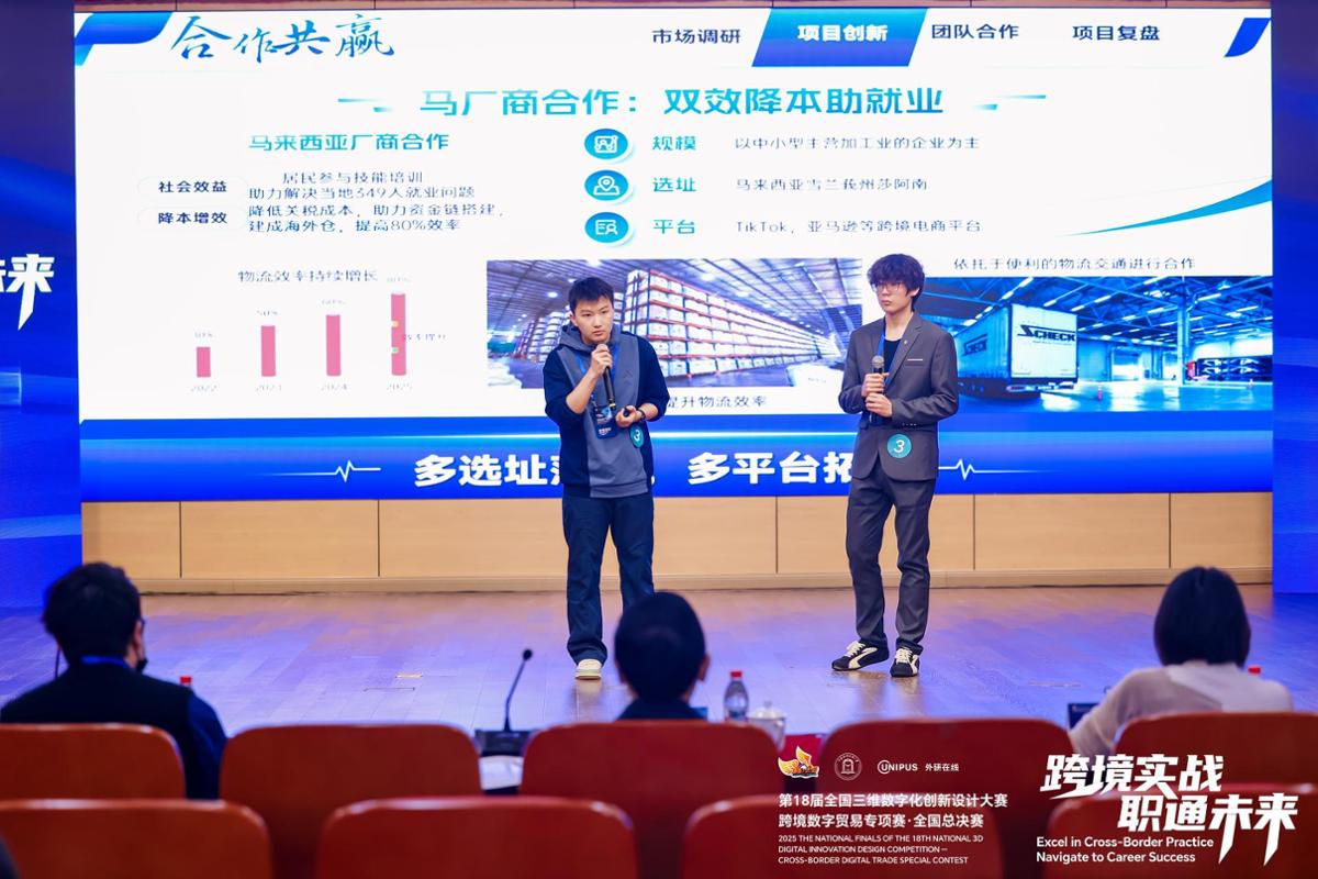 此次赛制共分为国内组和国际组的直播和短视频赛道,在比赛过程中,参赛成员根据要求深入挖掘跨境电商市场的巨大潜力,将研究重点聚焦于东南亚市场这一充满竞争且规模庞大的领域,充分发挥调研与数据分析的优势,结合当下流行的大数据与自媒体工具,策划“跨境电商直播”方案。从方案的初步构思、直播运营的具体实施到项目路演的精心准备,每一个环节都经过了团队的反复推敲与细致打磨。在路演环节,队员们以生动有趣的方式向评委和观众展示了选品特色。在答辩环节,学生们思路清晰、表达流畅,充分展示了项目的创新性与可行性,赢得了评委们的一致好评。指导老师们在本次参赛过程悉心为参赛队伍提供专业的指导和培训,和学生们共同打磨每一个环节。