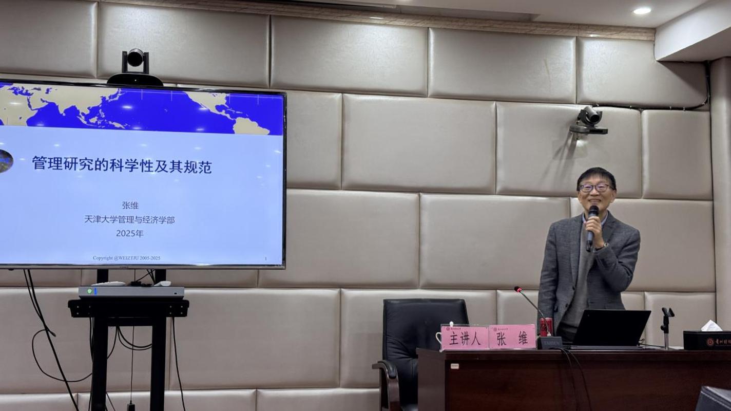 本网讯:(应用经济学院 向媛 图文报道)12月23日,应用经济学院第一期“思雅大讲堂”学术讲座在西区立德楼110会议室举办。天津大学讲席教授、复旦管理学杰出贡献奖获得者张维教授应邀为我校师生带来题为“管理研究的科学性及其规范”的精彩报告。本次讲座由副校长李烨主持,全校八十余名师生参与聆听。