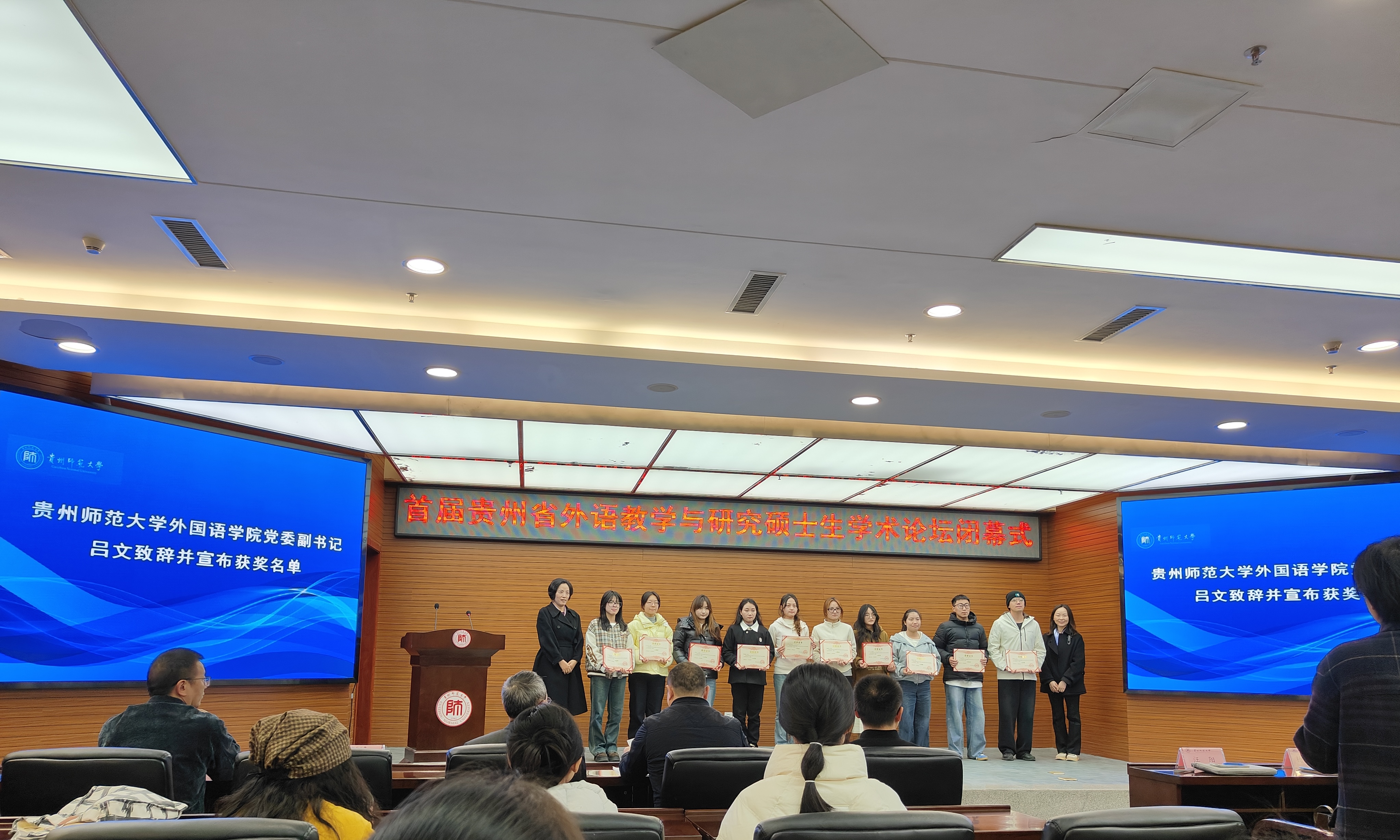 本网讯:(外语学院 曾一录 图文报道)近日,首届全省外语教学与研究硕士生学术论坛在贵州师范大学举行。论坛由省英语教育与研究学会主办,贵州师范大学外国语学院承办。论坛以“外语教学与研究的创新与实践”为主题,内容涵盖生态语言学、英语诗歌研究、翻译质量评估、语言生活研究等前沿领域,多位省内外知名专家学者应邀作主旨报告,论坛期间还组织了论文评比。外语学院副院长(主持工作)刘利音应邀参会并担任评委。
