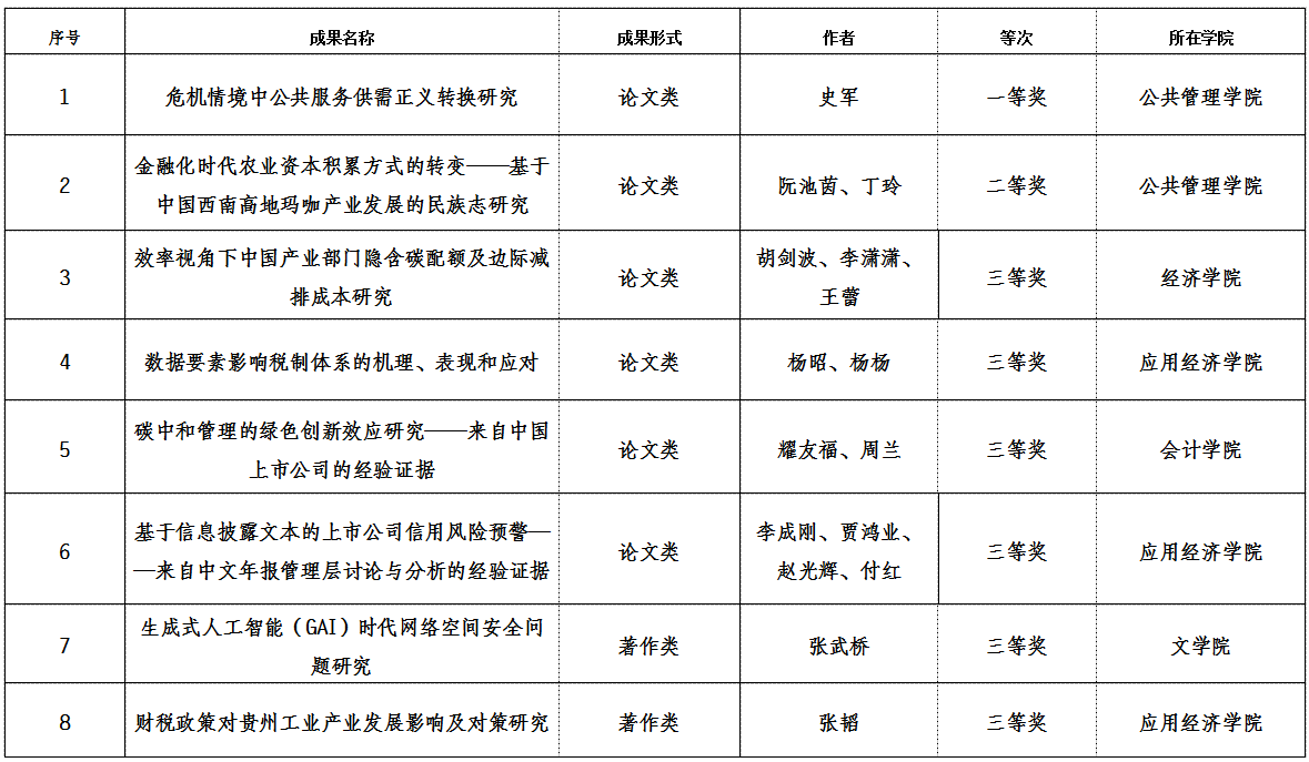 本次获奖成果涵盖经济学、管理学、政治学、社会学、新闻传播学等多个学科领域,既有立足理论前沿的学术探索,也有服务地方发展的实践应用,集中体现了我校科研工作者扎根贵州大地、服务国家战略的使命担当。