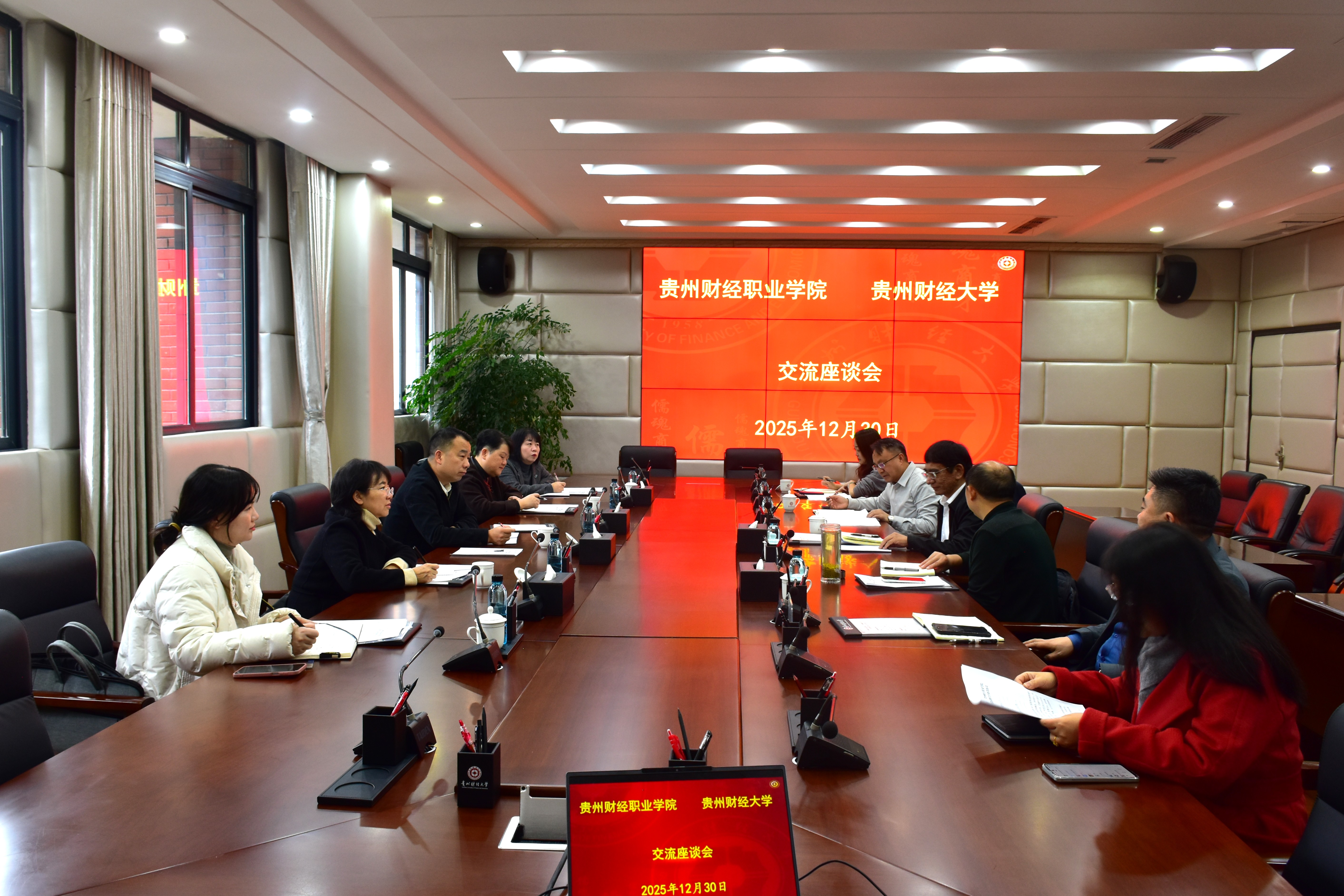 本网讯:(党政办公室(保密办、法律顾问处) 韦永领 |摄影 令狐语嫣)12月30日上午,贵州财经职业学院党委书记刘林锐率队访问我校,就人才培养与引进合作等事宜进行深入交流。我校党委书记缪坤和,校长、党委副书记李汉文,副校长、党委常委李烨及相关部门负责人出席座谈会。贵州财经职业学院党委副书记、院长邓川,党委委员、副院长肖燕及相关部门负责人参会。