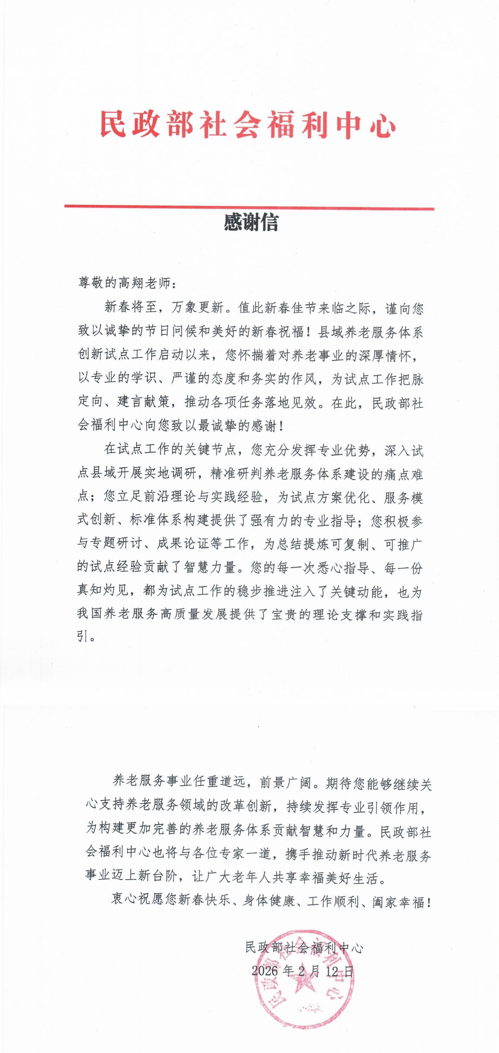 本网讯:(现代康旅产业学院 王超 图文报道)新春佳节来临之际,民政部社会福利中心向学校现代康旅产业学院高翔老师发来感谢信,对其在县域养老服务体系创新试点工作中作出的重要贡献致以诚挚谢意和新春祝福,高度肯定了其专业能力与务实作风为试点工作推进带来的关键作用。