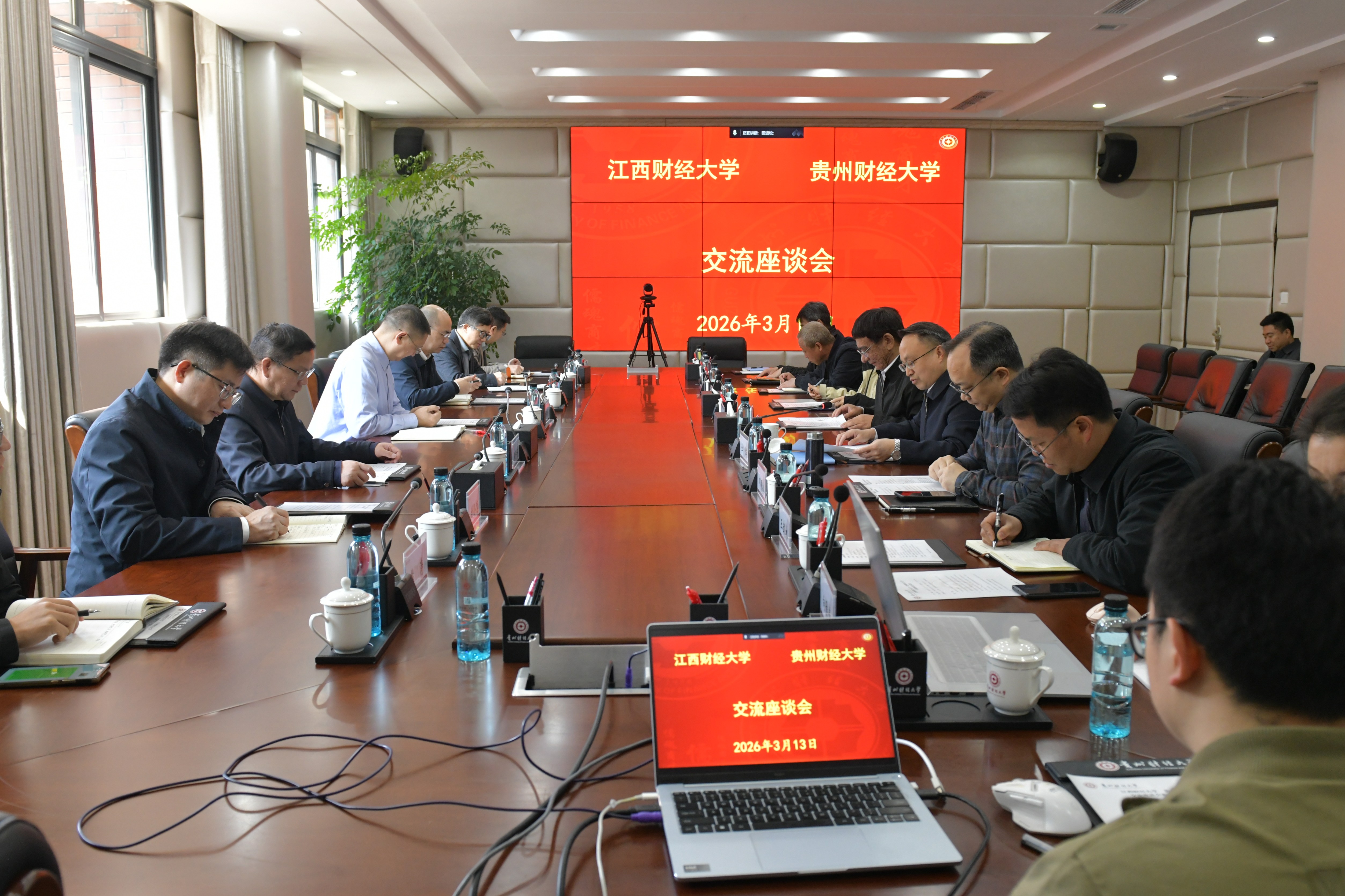 缪坤和代表学校对江西财经大学一行的到来表示诚挚欢迎,对江财长期以来给予我校学科建设、学位点申报、教学评估等工作的无私帮助与宝贵支持表示衷心感谢。他指出,贵财与江财同为扎根红色土地、服务地方经济发展的财经类高校,在办学定位、学科优势、发展方向上高度契合,合作空间广阔、潜力巨大。学校将以此次交流为纽带,积极落实合作共识,细化合作举措,推动双方在科技创新、学科建设、人才培养、社会服务等领域开展全方位、深层次合作,共同提升办学水平与服务区域经济社会发展能力。