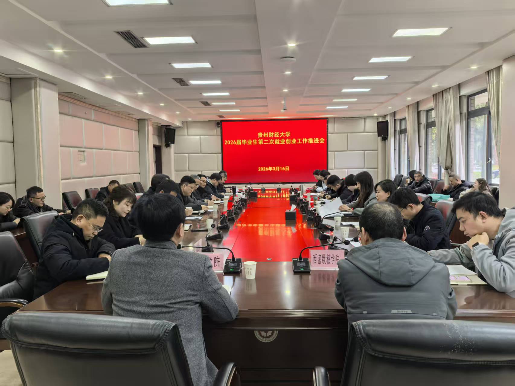 本网讯:(招生就业处 温浩 报道|摄影 王晨晓)为进一步夯实2026届毕业生就业工作基础,促进毕业生更充分更高质量就业,近日,我校在立德楼104会议室召开2026届毕业生第二次暨新学期首次就业创业工作推进会。副校长、党委常委徐艺出席会议并做总结发言,学生工作部、校团委、招生就业处负责人,各学院党委书记、分管就业工作党委副书记参加会议。会议由招生就业处处长王茜主持。