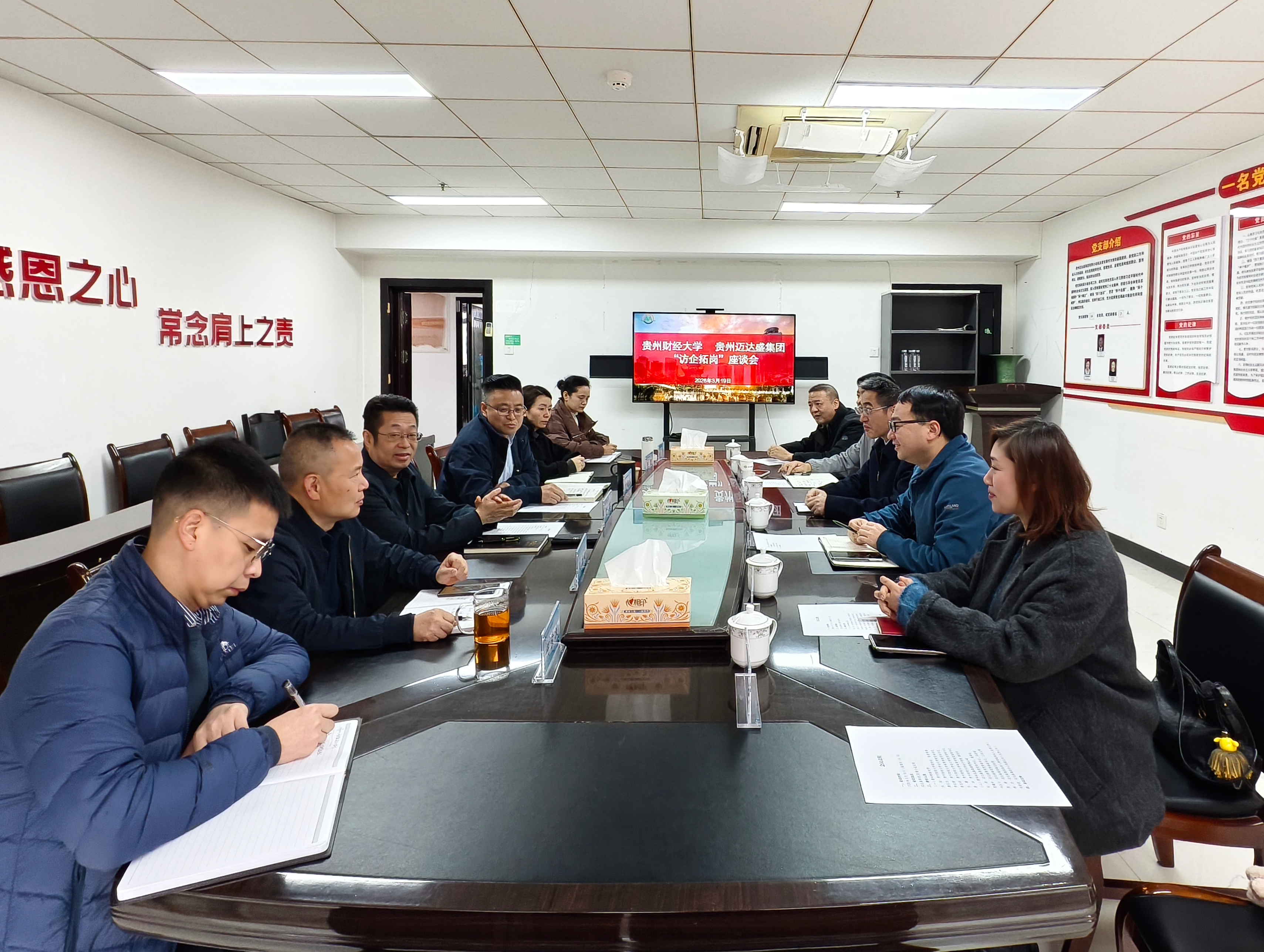 为本网讯:(会计学院 易洁 图文报道)进一步深化校企合作、拓宽毕业生就业渠道,推动产教融合、协同育人走深走实,2026年3月19日,贵州财经大学副校长、党委常委杜剑,会计学院党委书记唐文杰,体育学院党委书记李应智,会计学院党委副书记黄忠莉,体育学院党委副书记吕骥,会计学院2026届毕业班辅导员易洁前往贵州迈达盛集团有限公司(以下简称“迈达盛集团”)开展“访企拓岗”交流座谈会。迈达盛集团党委书记、董事长刘洪,党委副书记、总经理贾耀东,党委副书记、工会主席刘五七,副总经理张颖,组织人事部副部长林杰,办公室副主任何崇波出席会议,双方就校企合作等方面展开了深入交流。