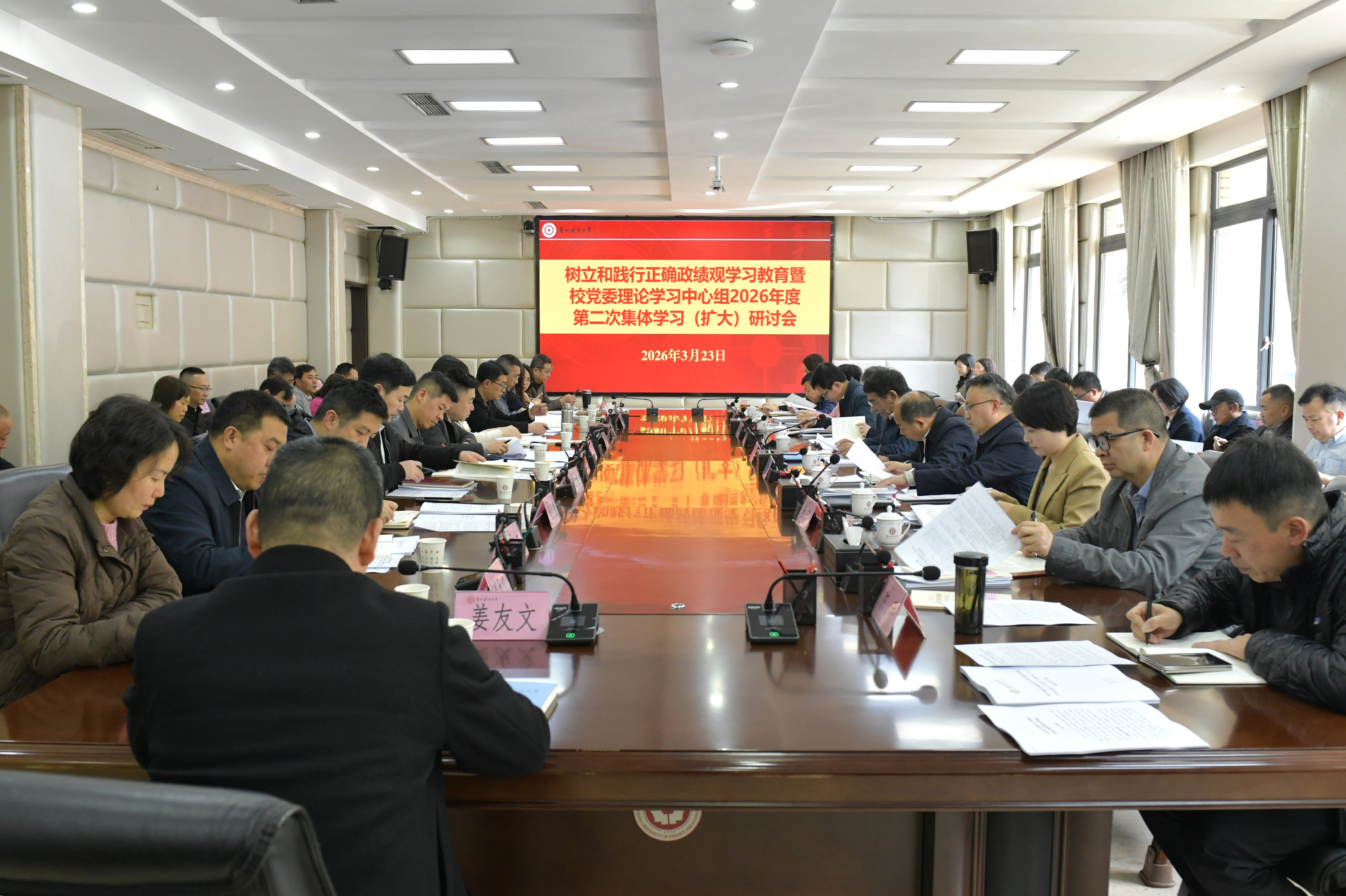 本网讯:(党委宣传部 周亚亚 报道|摄影 令狐语嫣)3月23日,树立和践行正确政绩观学习教育暨校党委理论学习中心组2026年度第二次集体学习(扩大)研讨会在西区立德楼104会议室举行。校党委领导班子成员、校党委委员出席会议。校党委书记缪坤和主持会议并讲话。