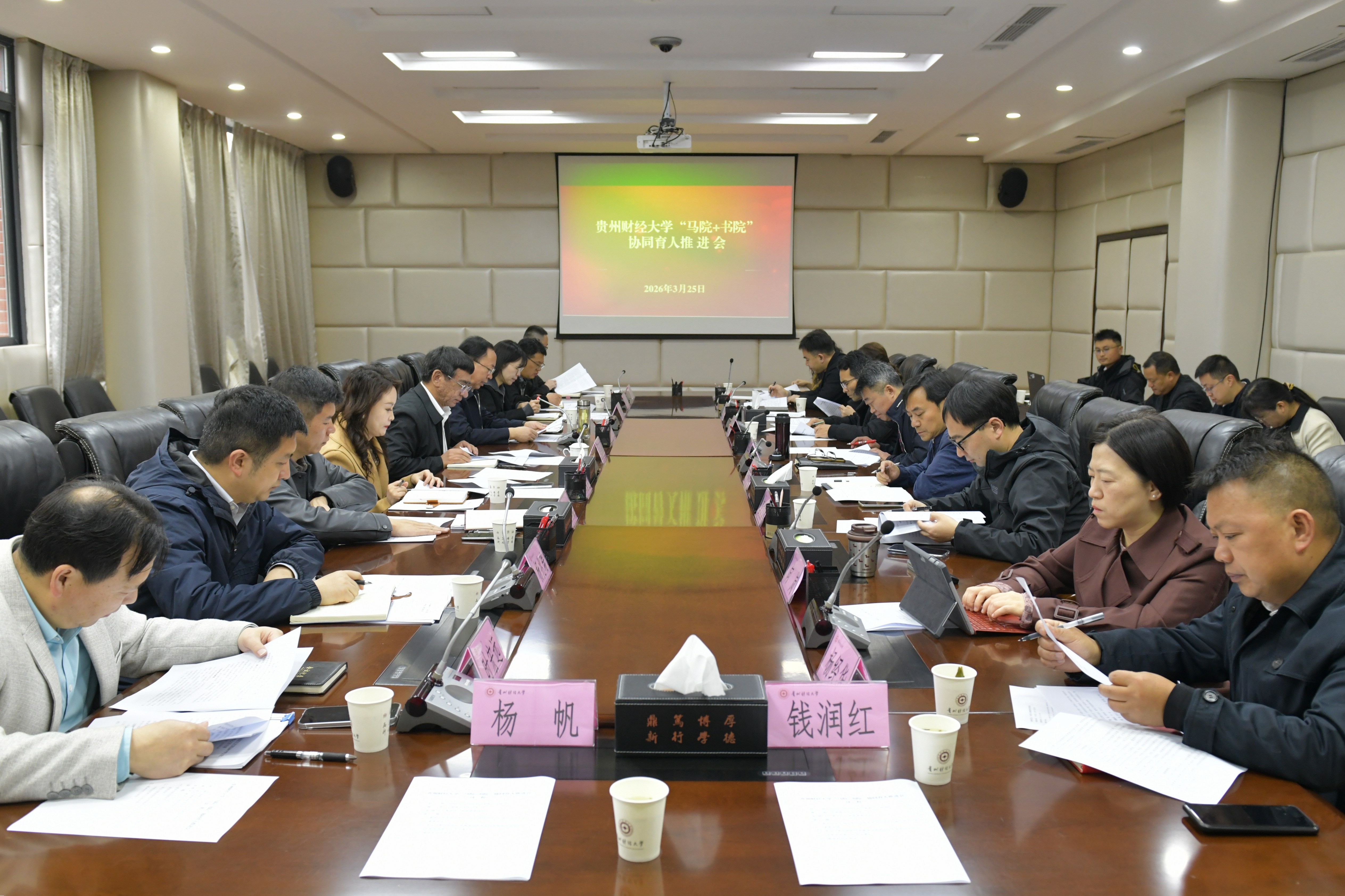 本网讯:(党委宣传部 王晓娟 报道|摄影 令狐语嫣)为深入学习贯彻习近平总书记关于“两个结合”的重要论述,全面落实省委、省委教育工委工作部署要求,系统谋划学校马克思主义学院与中华文化书院协同育人路径,3月25日,学校在立德楼428会议室召开“马院+书院”协同育人推进会,校党委书记缪坤和出席会议并讲话,校党委副书记唐本文主持会议。