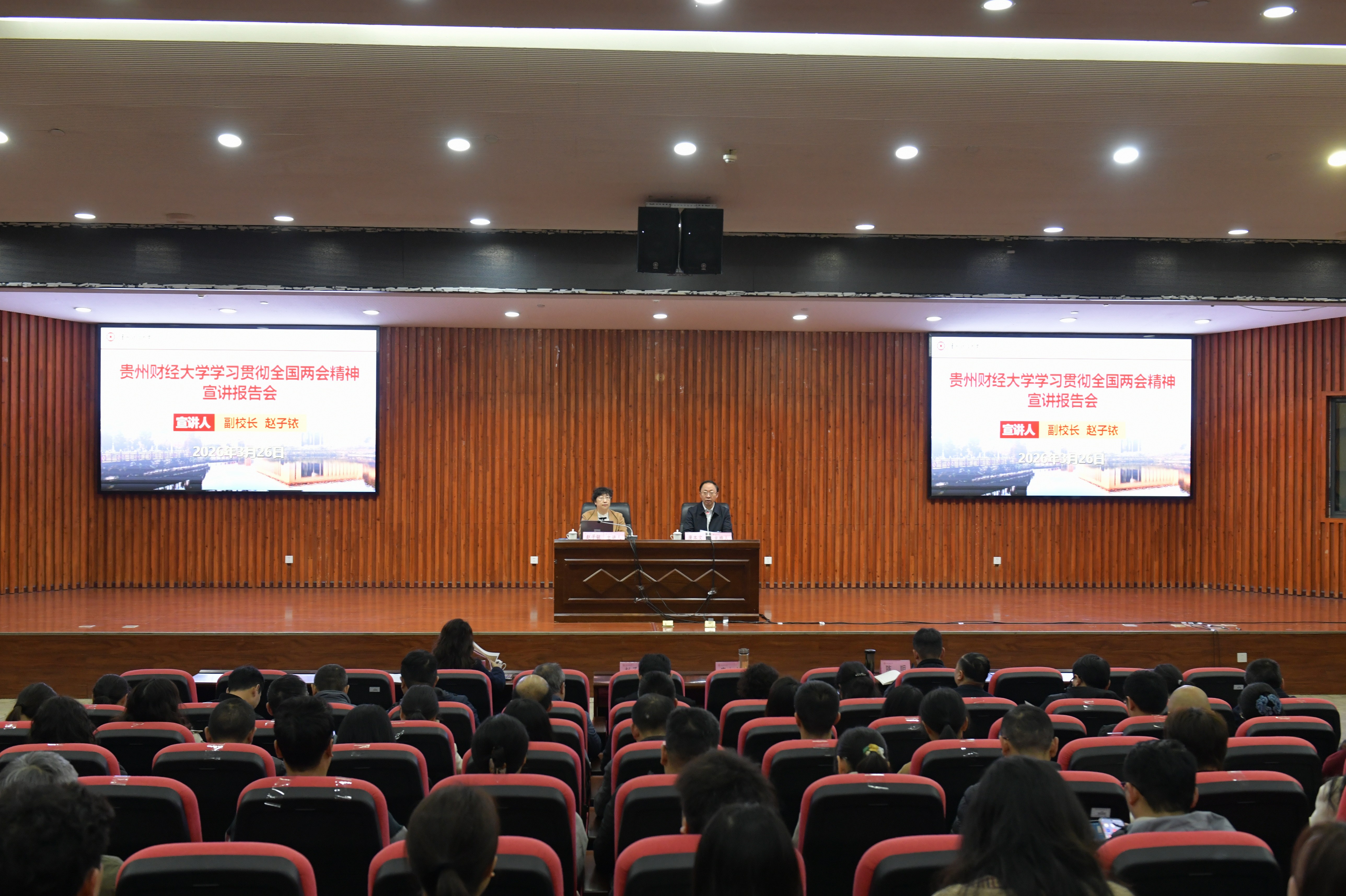 本网讯:(贵财新闻中心 李辛欣 报道|摄影 令狐语嫣)为深入学习贯彻2026年全国两会精神,3月26日上午,我校在西区图书馆报告厅举行学习贯彻全国两会精神宣讲报告会。各单位各部门处级干部和师生代表等200余人参会。全国人大代表、中国致公党贵州省委副主委、副校长赵子铱作专题宣讲,校党委副书记唐本文主持。
