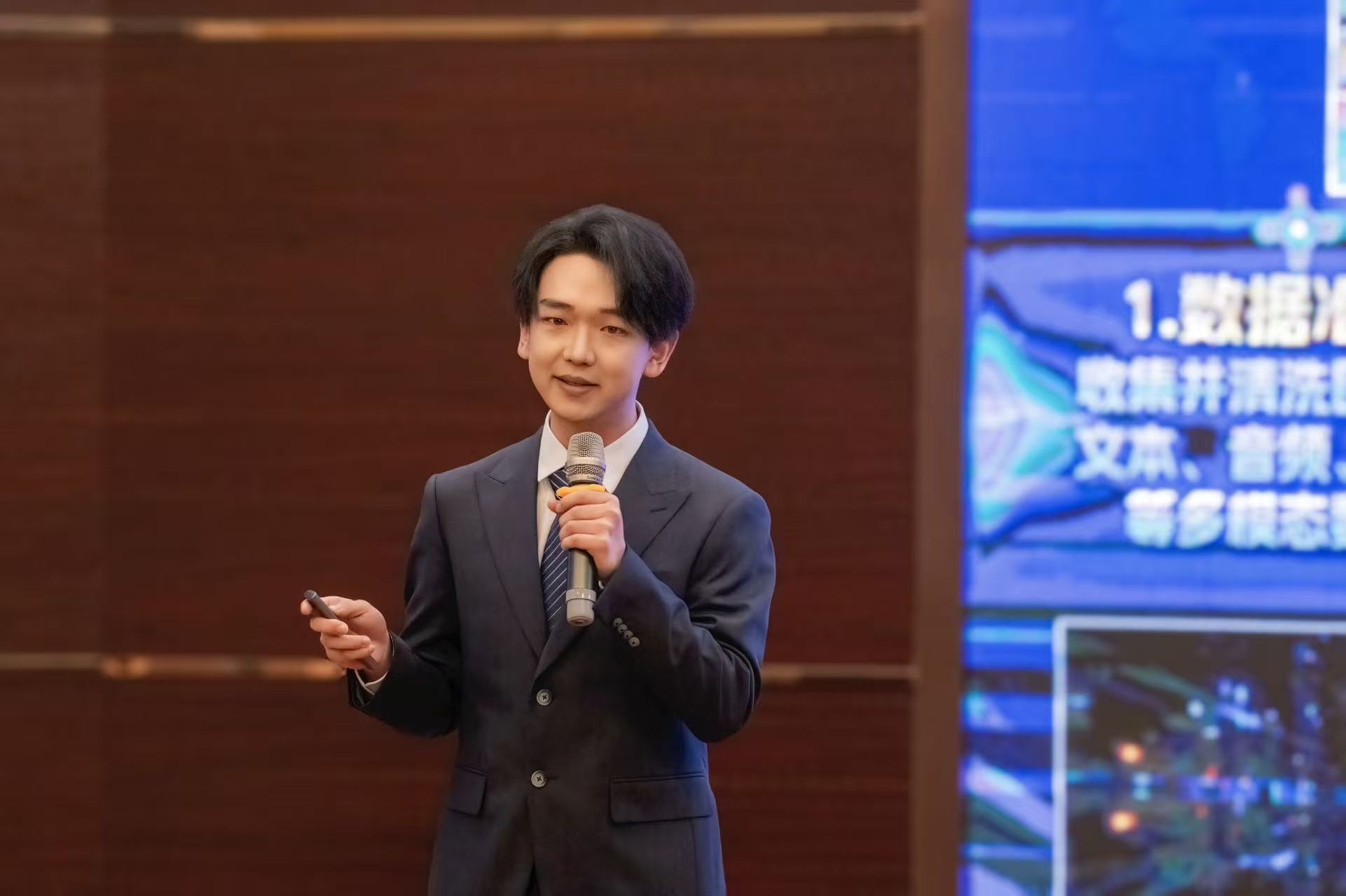 会议现场为获国赛金奖的项目团队颁奖,金奖项目代表的精彩路演持续点燃全场热烈氛围。我校“墨智双擎—多模态品牌服务大模型引领者”项目负责人王梓腾介绍了团队开发的专属定制化品牌服务大模型应用,能够面向创作个体和小微企业提供一站式、个性化的全流程品牌智能服务。