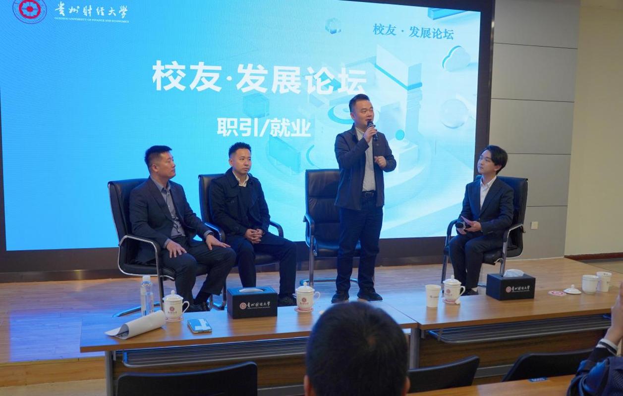 杨勇对三位校友的到来表示热烈欢迎和衷心感谢,向到场的全体师生致以亲切问候。他表示,本次论坛的举办,是校友会凝聚校友力量、赋能人才培养的重要举措,希望以此为契机,让优秀校友的成长经验、行业见解成为在校生职业道路上的 “指南针”,帮助大家少走弯路,找准方向,努力成长为兼具专业素养和综合能力的优秀人才,共同为国家强盛与民族富强贡献贵财担当。