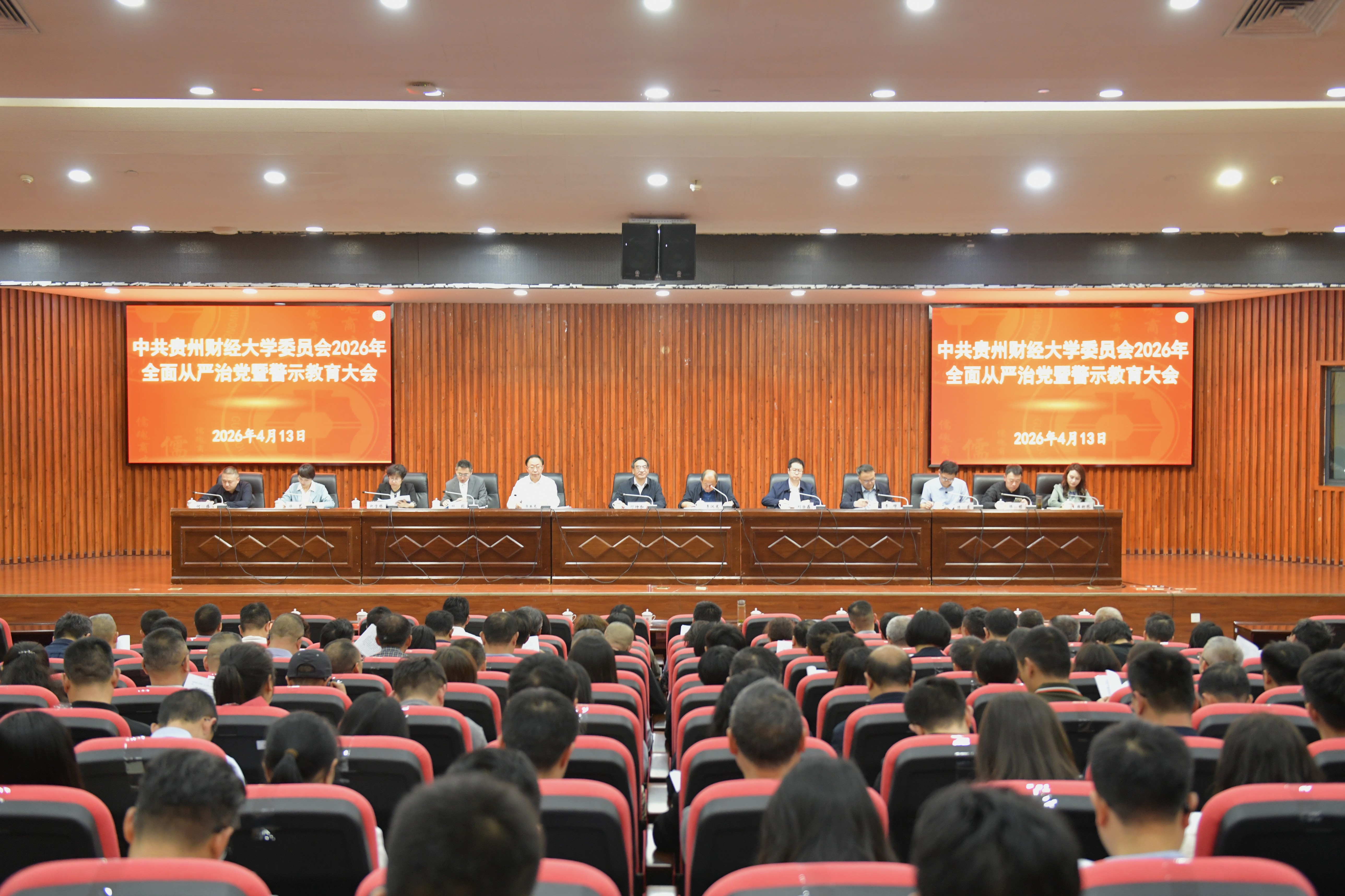 本网讯:(机关纪委 杨晓华 报道|摄影 令狐语嫣)4月13日,学校党委2026年全面从严治党暨警示教育大会在图书馆报告厅召开。校党委书记缪坤和出席会议并讲话,校党委副书记、校长李汉文主持会议,校领导、全体处级干部、省纪委省监委派驻贵州财经大学纪检监察组内设机构负责人、各二级单位纪委书记、全面从严治党办全体干部参加会议。