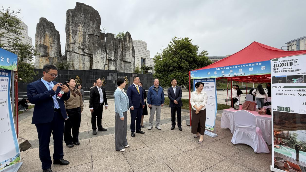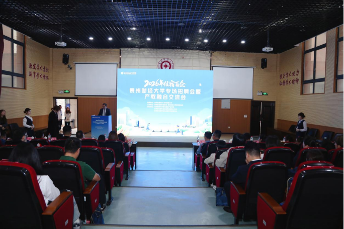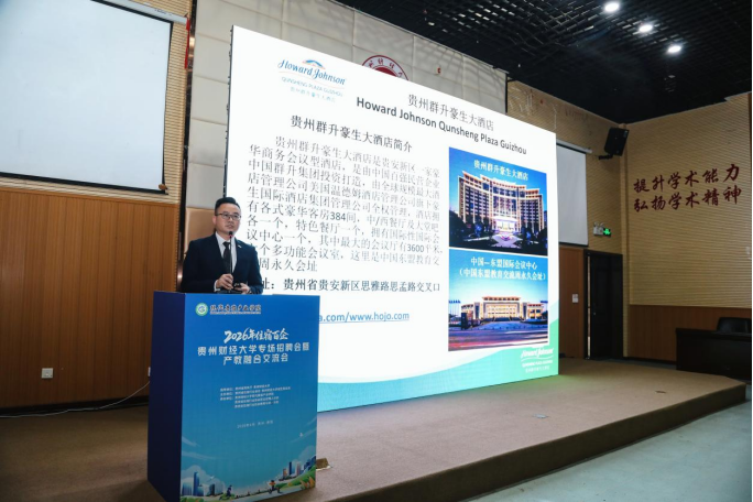 本网讯:(现代康旅产业学院 吕孟学 图文报道)4月21日,2026年住宿百企贵州财经大学专场招聘会暨产教融合交流会在我校崇德楼一楼报告厅举行。本次活动由省商务厅和我校指导,省住宿行业协会、我校招生就业处主办,我校现代康旅产业学院、省住宿行业协会职业经理人分会、省住宿行业协会教育与培训分会承办,汇聚了住宿行业百余家企业与校方共促就业对接、深化产教融合。省商务厅党组成员、副厅长朱霖毅,省商务厅服贸处副处长(主持工作)郑灵芝,省住宿行业协会会长黄海、副会长刘勇军、揭历航、余兰、秘书长黄正红、副秘书长梁大唐,省住宿行业协会职业经理人分会副会长范敏、秘书长李红琼、副秘书长提璧嘉、范小艺;我校党委常委、副校长陈震,我校现代康旅产业学院党委书记张世雄及学院全体职工和有关企业代表参加会议。