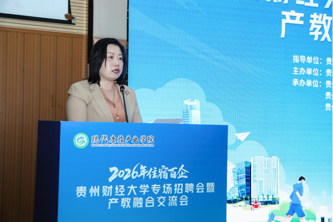 朱霖毅随后致辞。她指出,住宿行业是贵州省文旅消费与服务业发展的重要支撑,当前行业正处于转型升级关键期,对专业人才需求迫切。此次活动搭建了校企对接的优质平台,既帮助企业精准吸纳后备力量,也推动教育链与产业链深度衔接,希望校企持续深化合作,为贵州省住宿行业高质量发展注入新鲜动能。