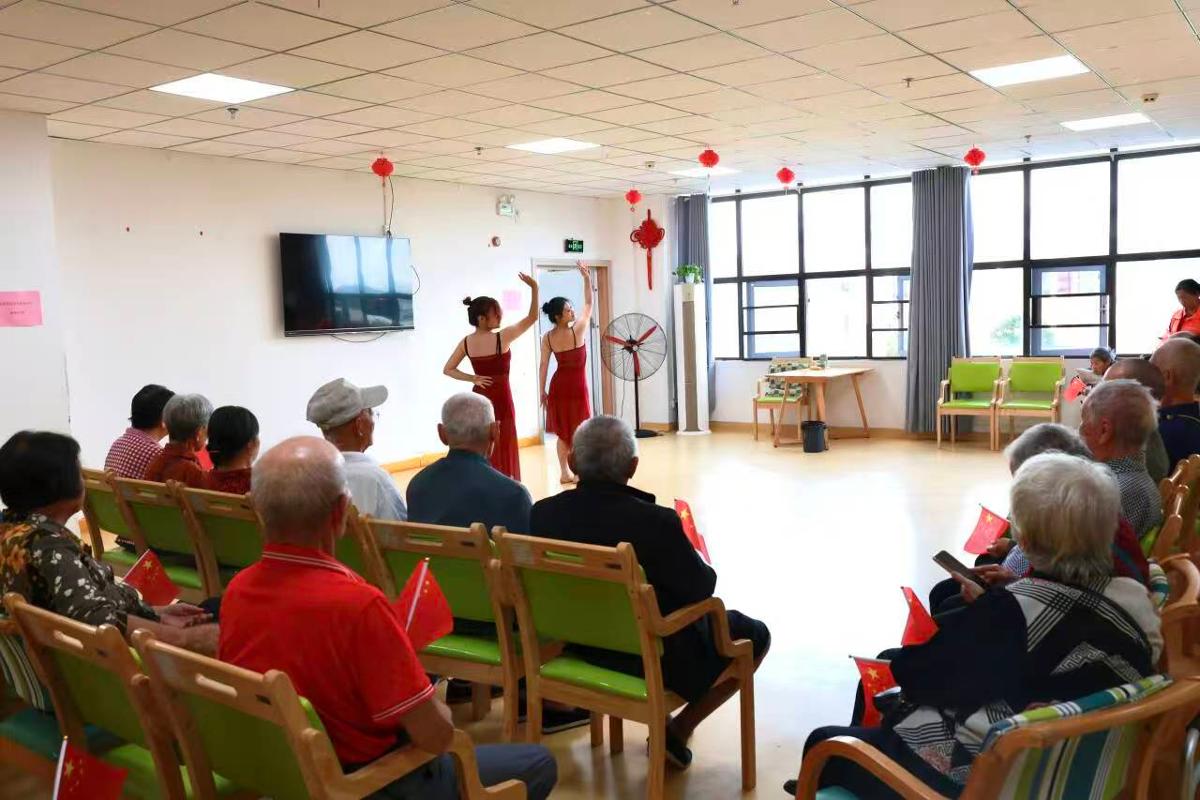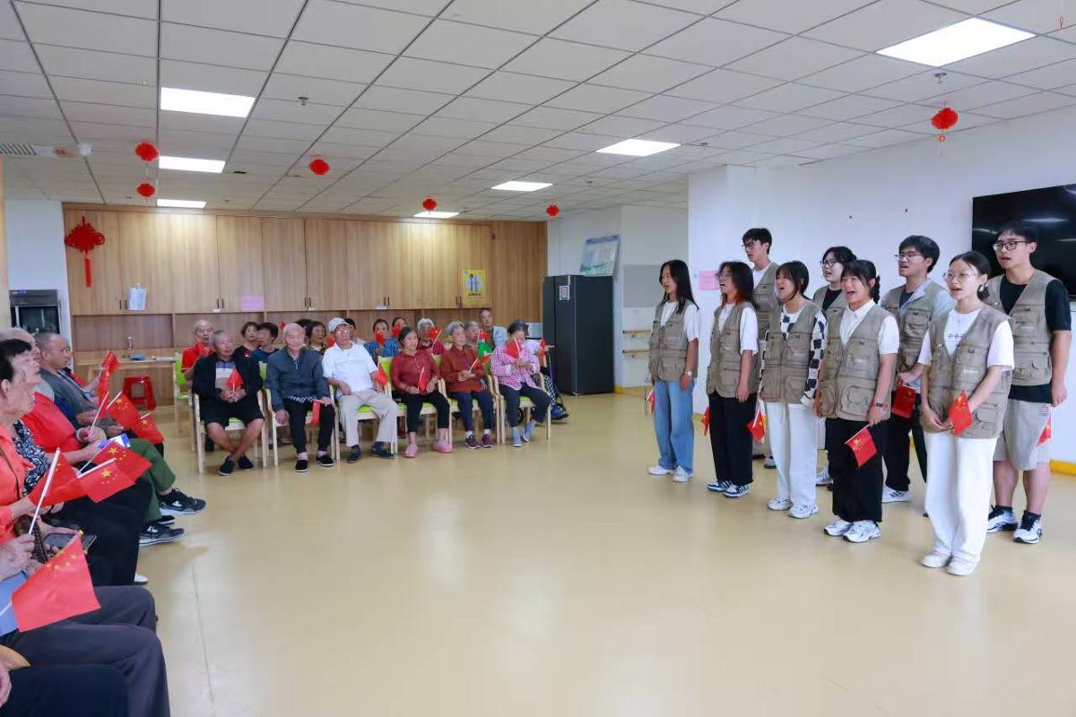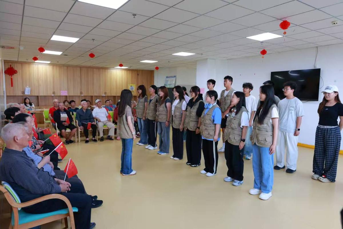 活动当日,敬老院内欢声笑语,气氛温馨而热烈。志愿者们首先为老人们献上了一场精心准备的文艺表演。民族舞开场瞬间点燃了现场气氛,深情的诗朗诵表达了对祖国的热爱与对长辈的敬意。随后,志愿者们唱响了《没有共产党就没有新中国》等经典红色歌曲,熟悉的旋律引发了老人们的共鸣,不少老人跟着节奏轻轻哼唱,眼中闪烁着感动与自豪的泪光。歌声与掌声交织,不仅是对往昔岁月的追忆,更是对当下美好生活与祖国繁荣昌盛的共同赞颂。