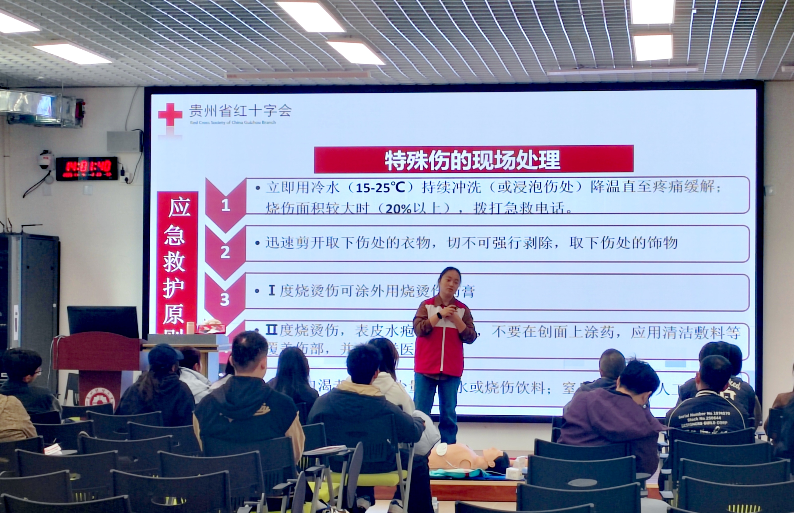 本网讯:(经济学院 魏来 图文报道)为构建校园安全防线,提升师生应急救护能力,11月4日,经济学院团委、大学生校园危机事件预警应对工作室邀请贵州省红十字会应急救护服务中心,在学院“一站式”社区为学院学工团队和学生骨干组织开展了一场专业系统的急救员培训活动。