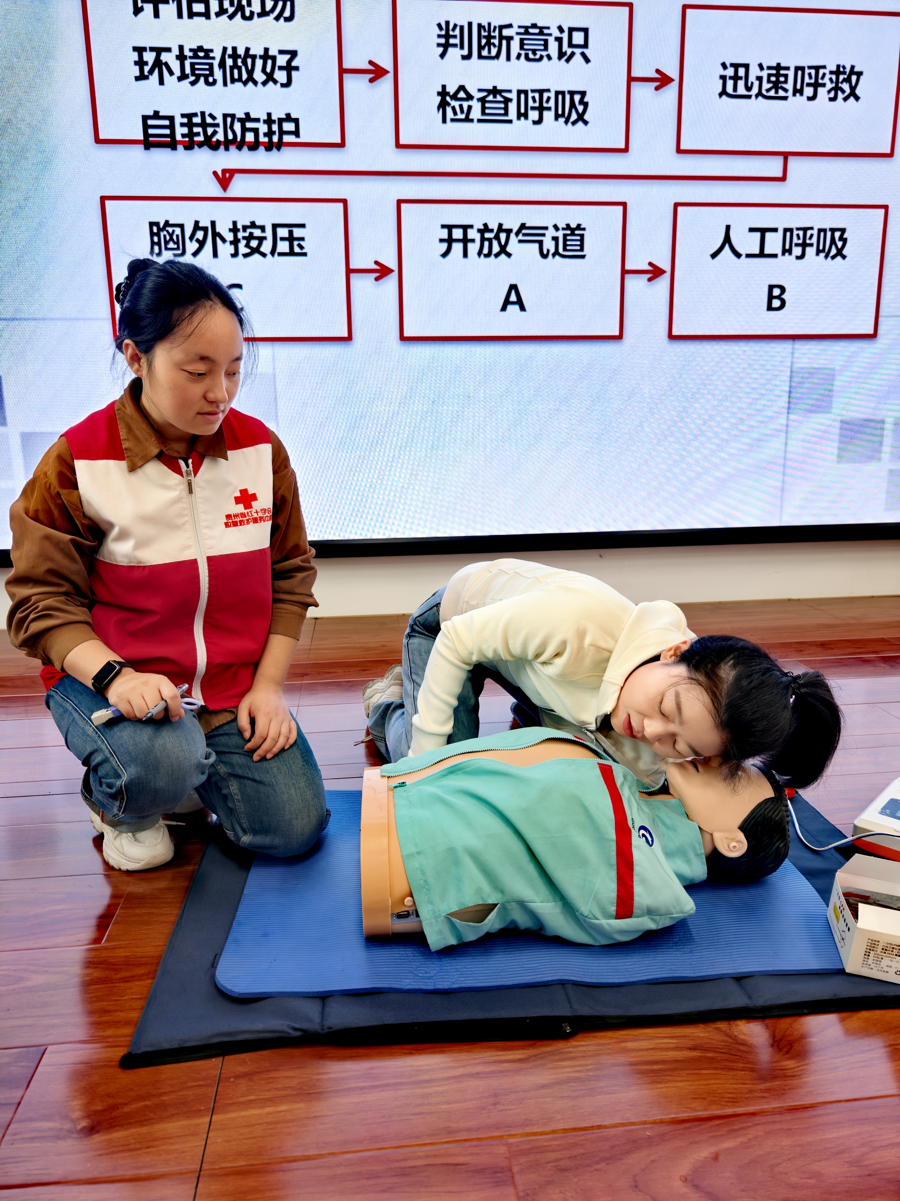 此次培训重点针对学工团队和学生骨干,通过专业化培训,强化一线工作人员初步处置突发事件的能力,为专业救援争取宝贵时间。采用“理论讲解+实操演练+考核认证”的模式,涵盖心肺复苏、AED使用、气道异物梗阻急救等关键技能。在理论教学部分,贵州省红十字会应急救护服务中心陈梅讲师以“黄金四分钟”救援理念为切入点,详细讲解了心搏骤停的诊断要点、心肺复苏的操作方法和终止特征。通过多媒体演示和真实案例剖析,生动阐述了急救要点和注意事项。实操演练环节,师生们在讲师一对一指导下,使用模拟人、创伤模型等专业教具,反复练习胸外按压、人工呼吸、绷带包扎等关键动作。培训采用“角色轮换演练法”,学员们依次扮演施救者和伤者,完成全流程救护模拟。参加培训的学生骨干表示:“通过这次培训,我不仅掌握了应急救护的基本技能,更深刻地体会到了时间就是生命的真谛”。