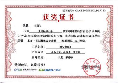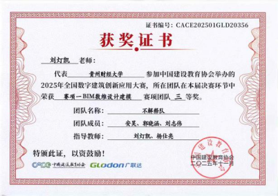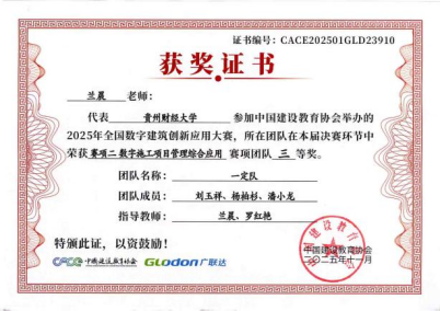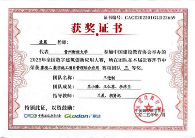在数字建筑项目管理综合应用赛项中,参赛的两支队伍“一定队”、“三进制”队,与来自全国的665支高校队伍同台竞技,均取得了三等奖的优异成绩。参赛队伍“一定队”由指导老师兰晨、罗红艳带领,学生团队成员包括刘玉祥(队长)、杨柏杉、潘小龙。参赛队伍“三进制”队由指导老师兰晨、胡贤旭带领,学生团队成员包括兰小腾(队长)、王仁茜、李洁兰。