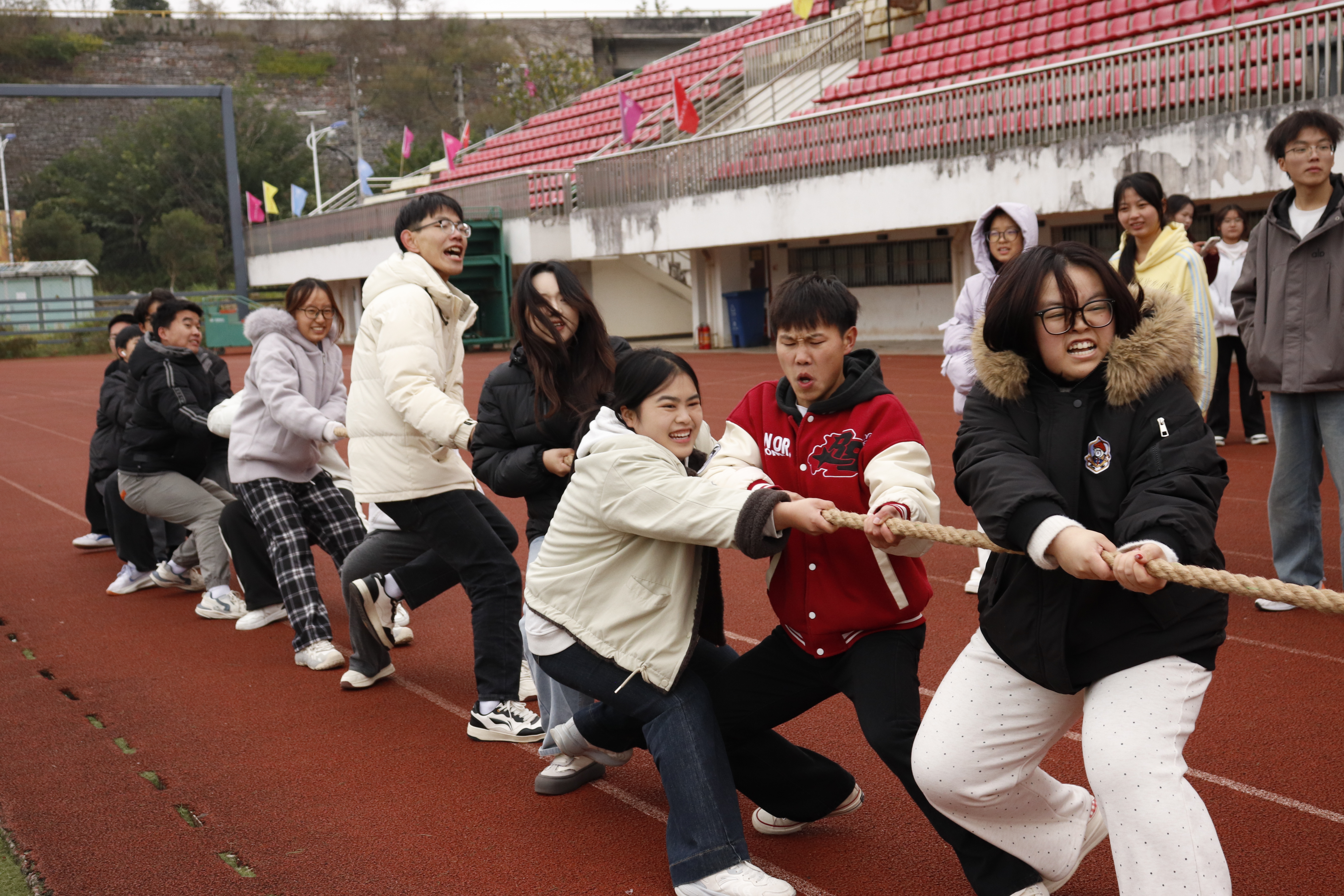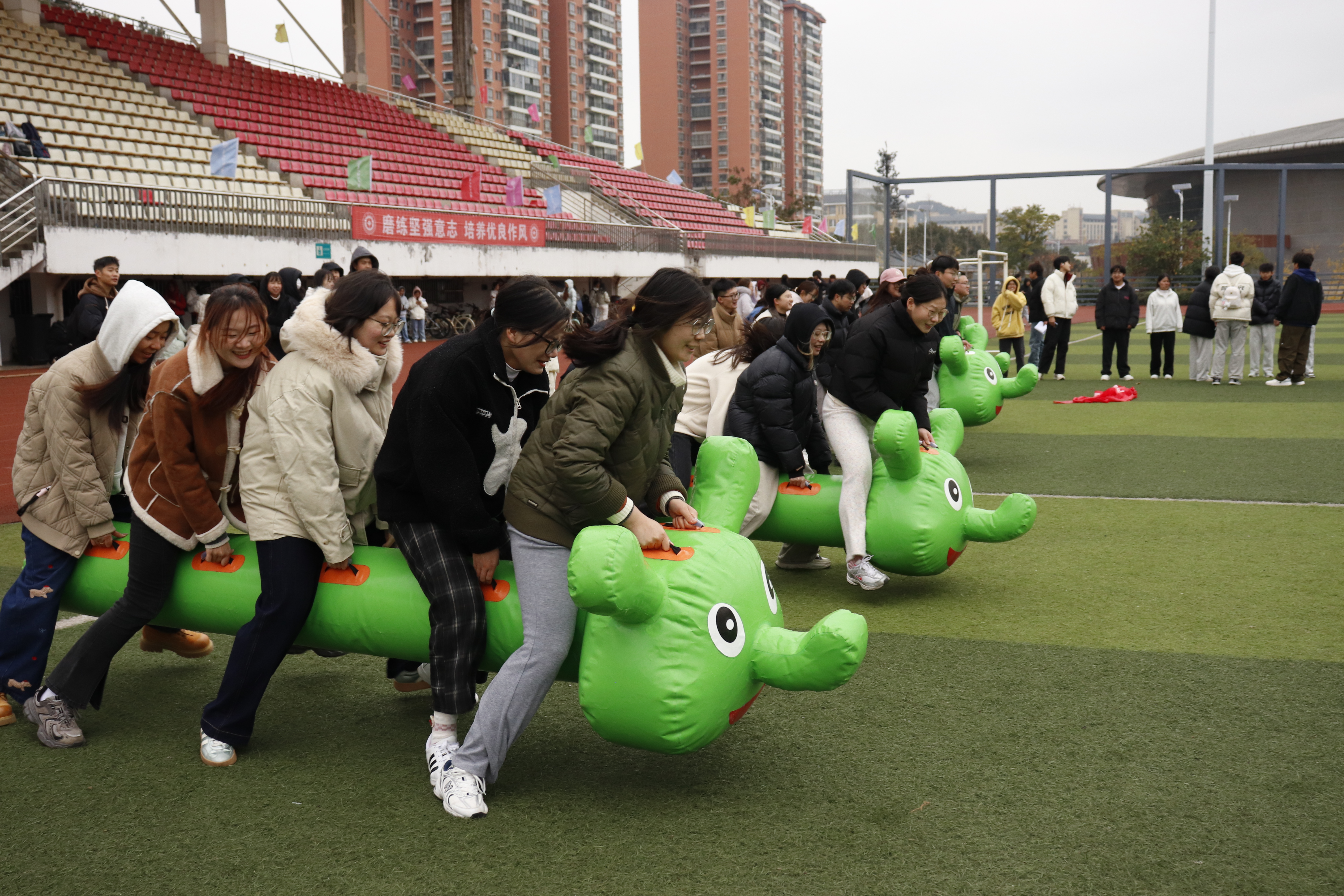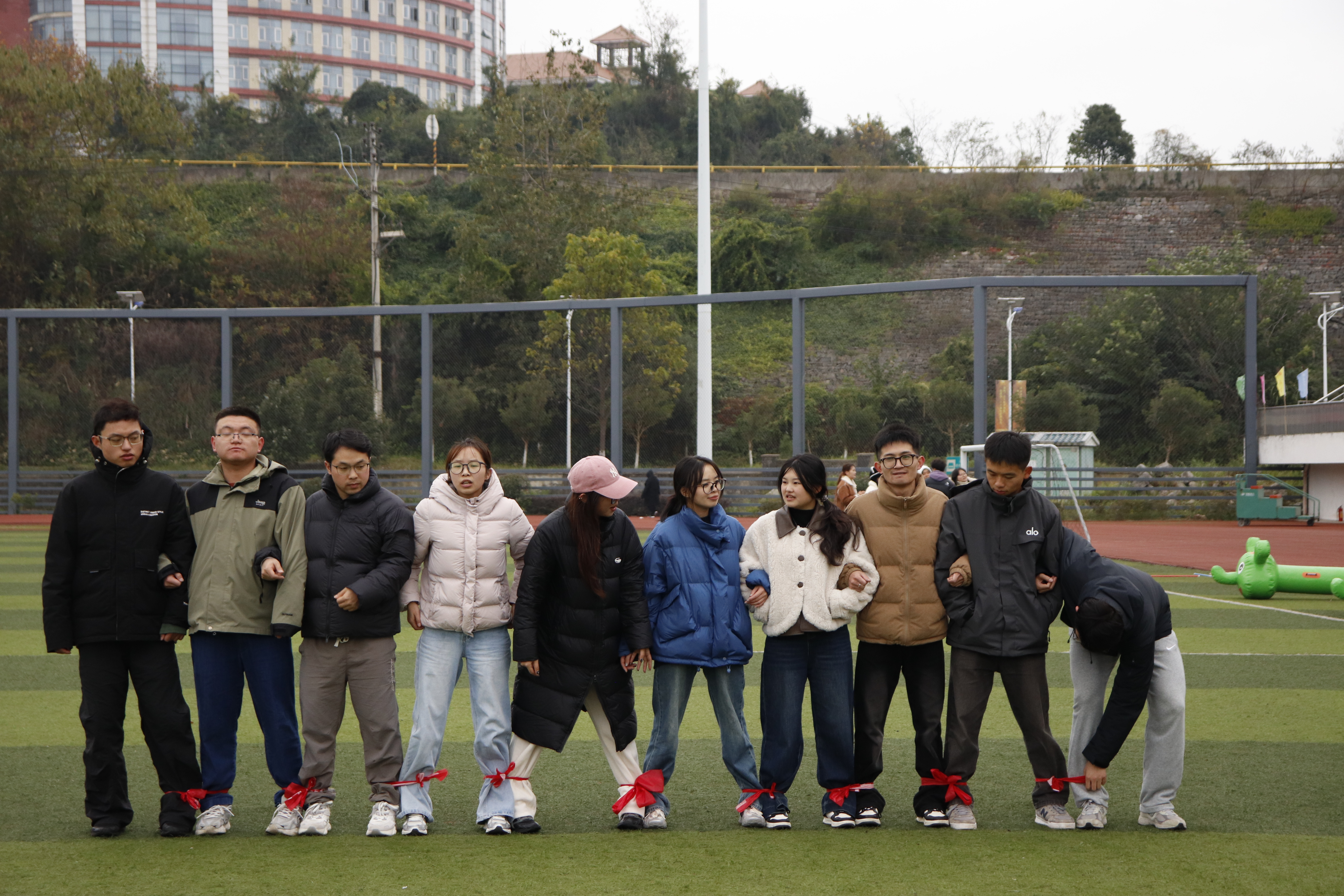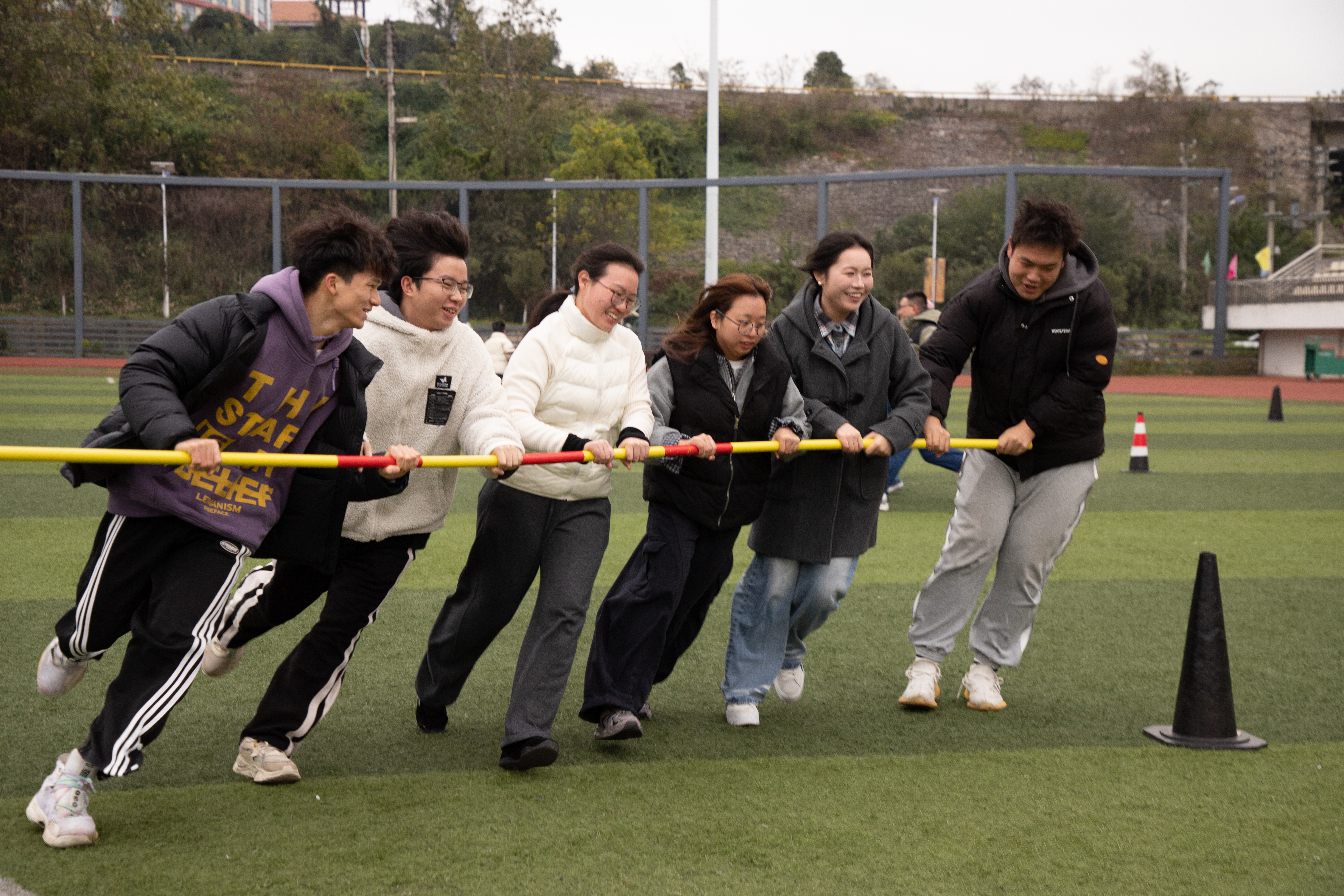 随着一声清脆的哨响,摸石过河、毛毛虫竞赛、拔河比赛、气球保卫战等九大趣味项目依次展开。赛场上没有激烈竞技的紧张感,取而代之的是并肩作战的默契与欢笑;没有严苛的胜负计较,更多的是全力以赴的热爱与坚持。选手们时而默契配合完成挑战,时而灵活应变攻克难关,每一个精彩瞬间都赢得现场观众的阵阵喝彩。这场运动会,比拼的不只是速度与力量,更考验着团队的协作精神与策略智慧。