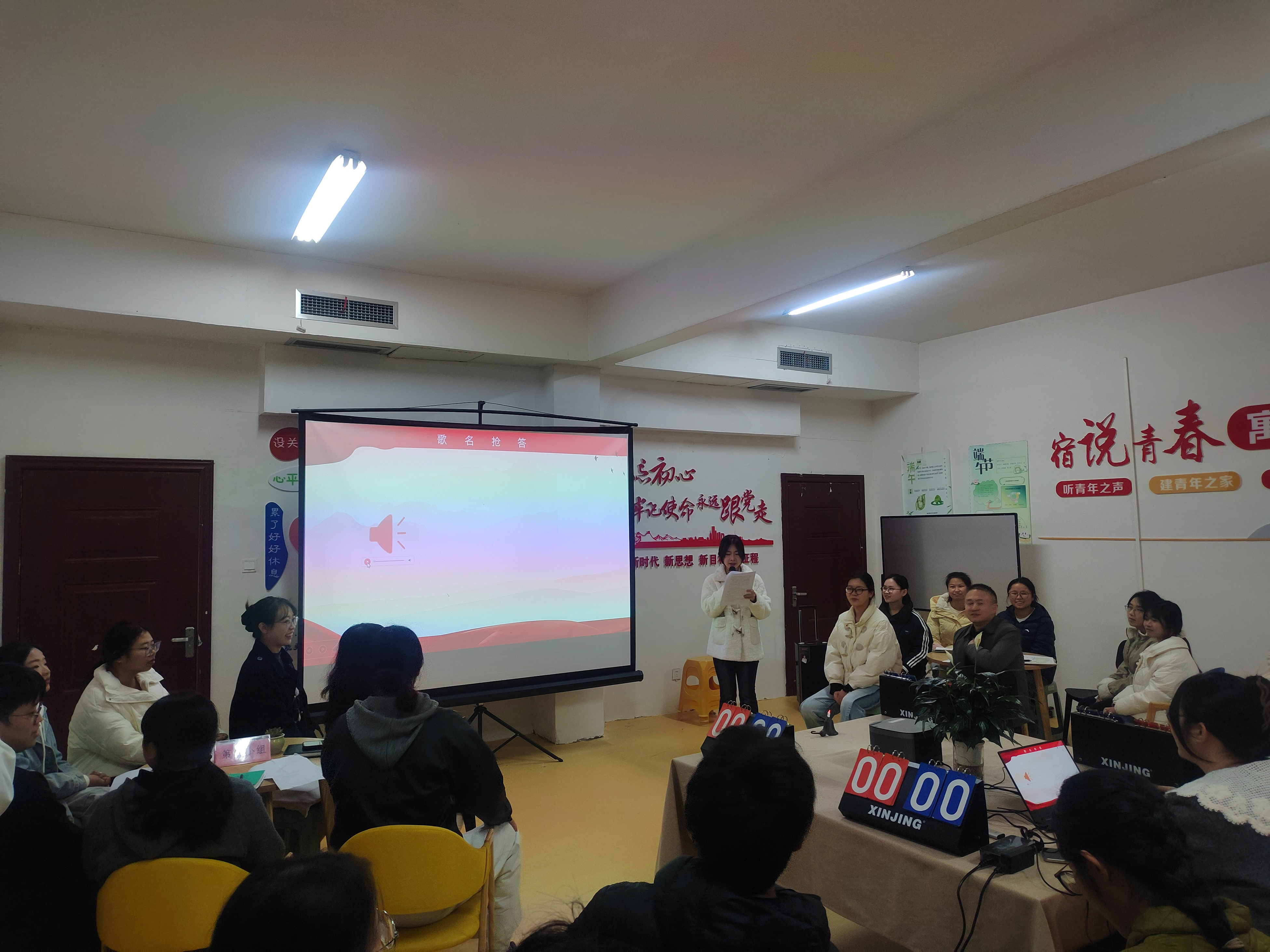 活动以红歌为主线,贯穿“红色旋律”抢猜竞答、“红歌故事”深度挖掘与“红歌精神”交流研讨三大环节。师生党员通过随机分组,在抢答与接龙中重温经典旋律,在协作探究中解读《义勇军进行曲》《东方红》等作品背后的精神谱系,并结合学习生活实际,畅谈红歌精神的时代回响,在沉浸式、互动性的组织生活中深化党史认知,凝聚思想共识。