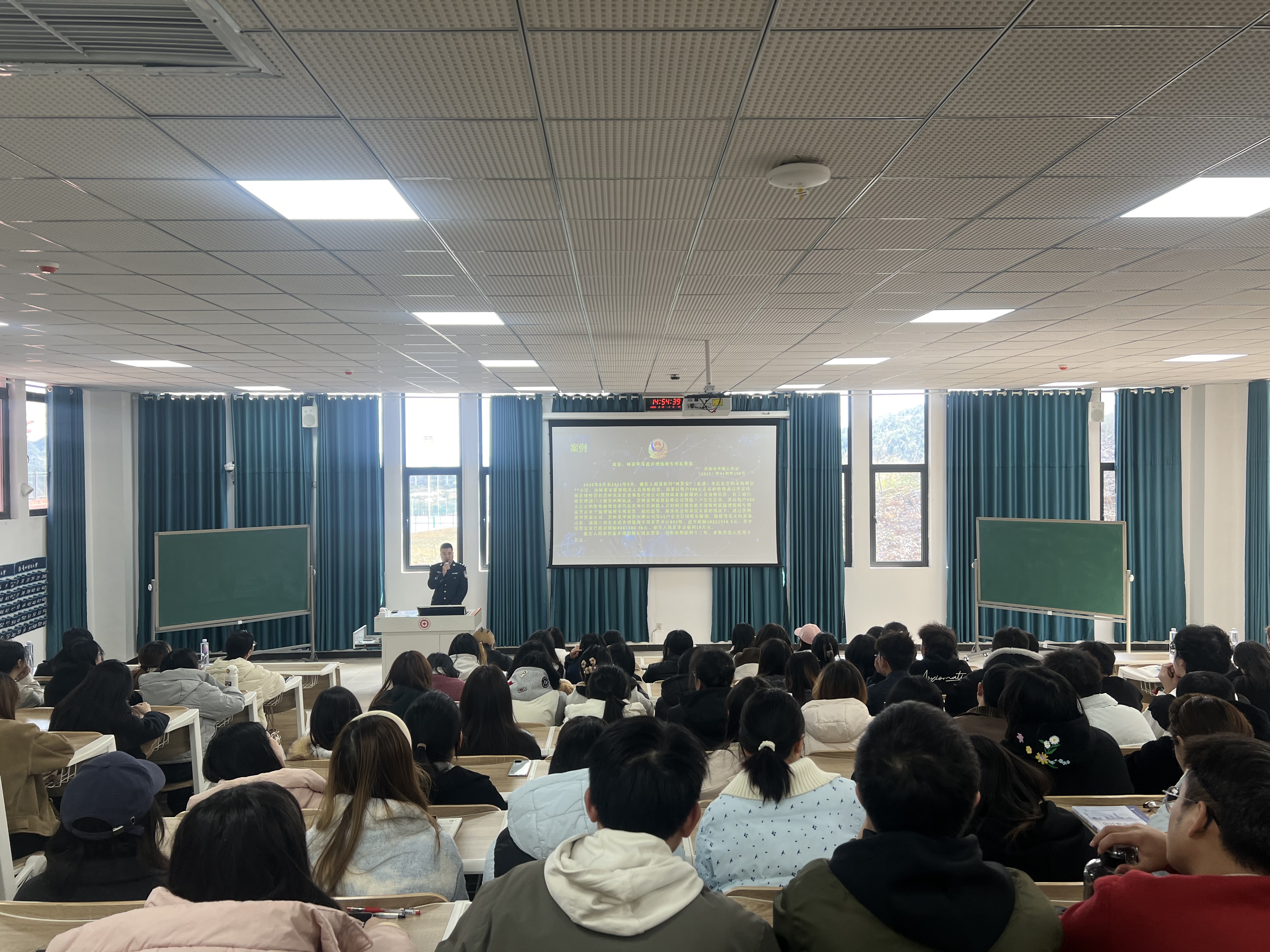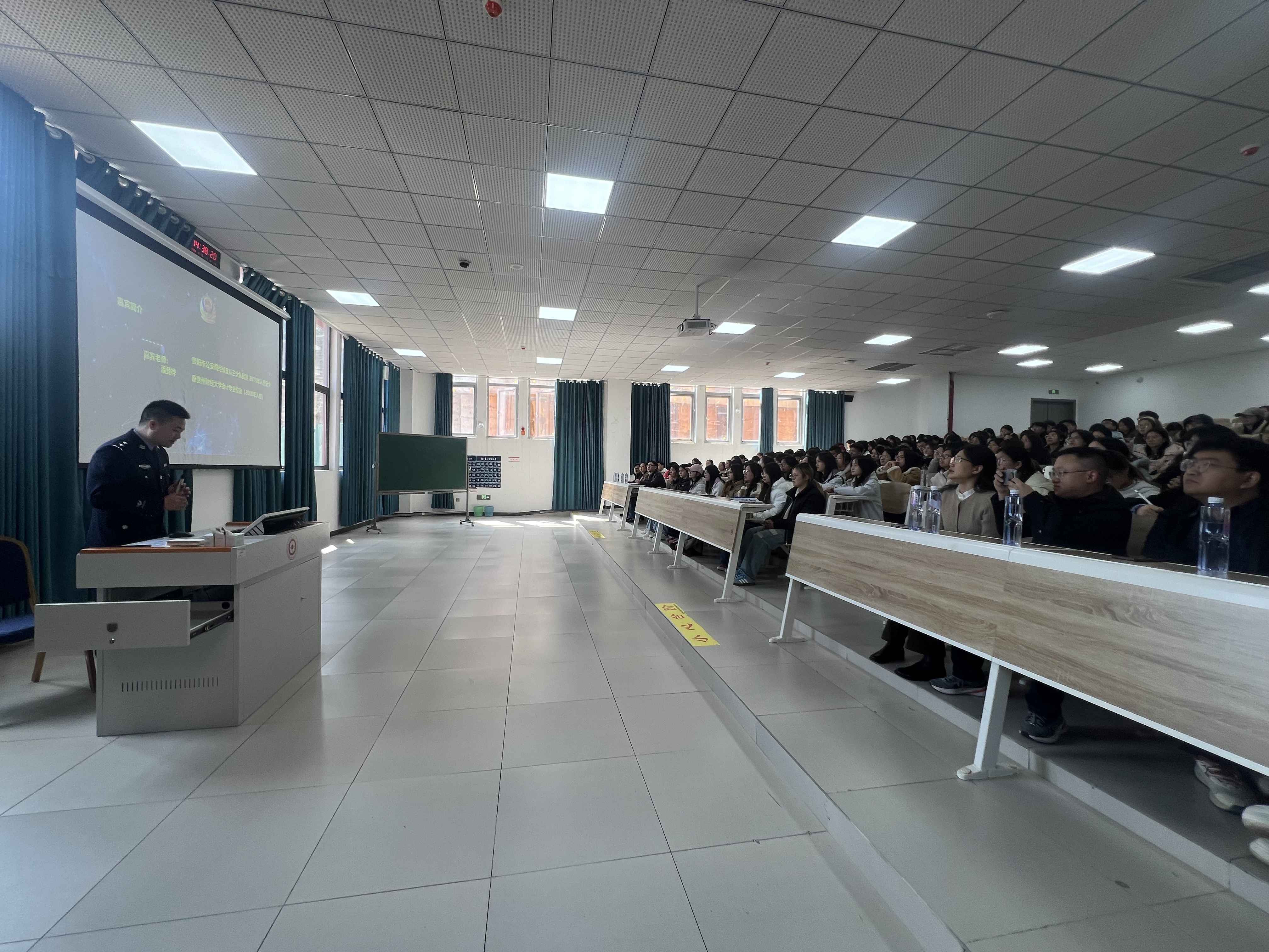 本网讯:(会计学院 徐筱彧 图文报道)为深化课程思政建设,强化学生职业道德意识,3月10日贵州财经大学课程思政教学研究示范中心、会计学院课程思政教学研究中心、会计职业道德课程组在文雅楼阶梯教室2-1开展了以“财会从业人员涉刑风险防范”为主题的警示教育活动。活动特邀贵阳市公安局经侦支队潘登桦警官担任主讲嘉宾。会计学院党委书记唐文杰、院长邱静、副书记黄忠莉、副院长周松,高等教育研究与评估中心主任、会计职业道德课程负责人钱润红,课程组全体成员,以及2023级会计学专业全体学生参加了此次活动。