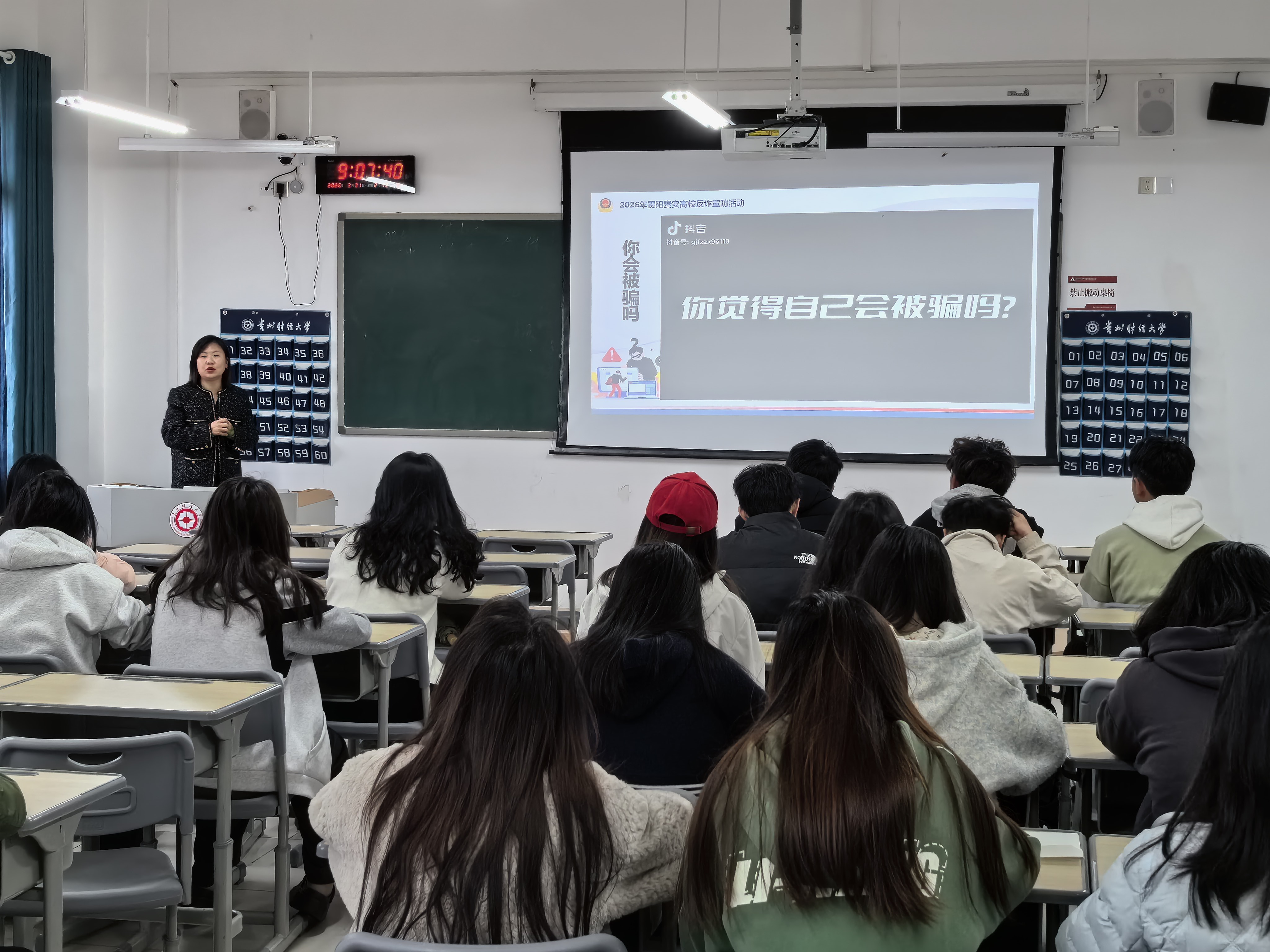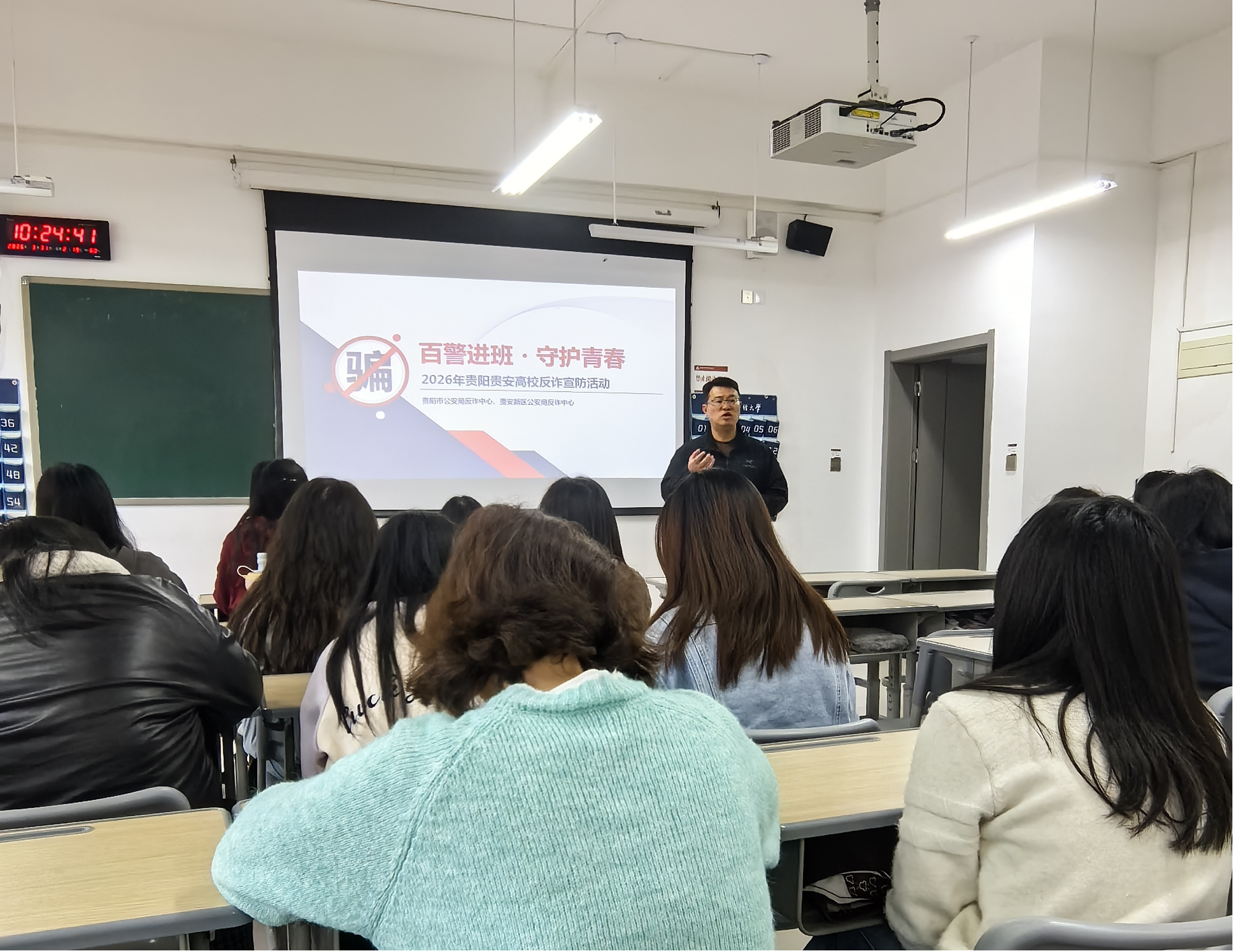 本网讯:(党委保卫工作部 张天 图文报道)为进一步强化校园反诈防骗工作,提升全体学生的反诈意识和自我防范能力,有效遏制校园诈骗案件发生,守护学生财产安全,3月30日以来,党委保卫工作部联合贵安新区公安局、组织校内反诈教师宣讲团,深入17个学院以小班级形式,开展学生全覆盖反诈专题宣讲活动。