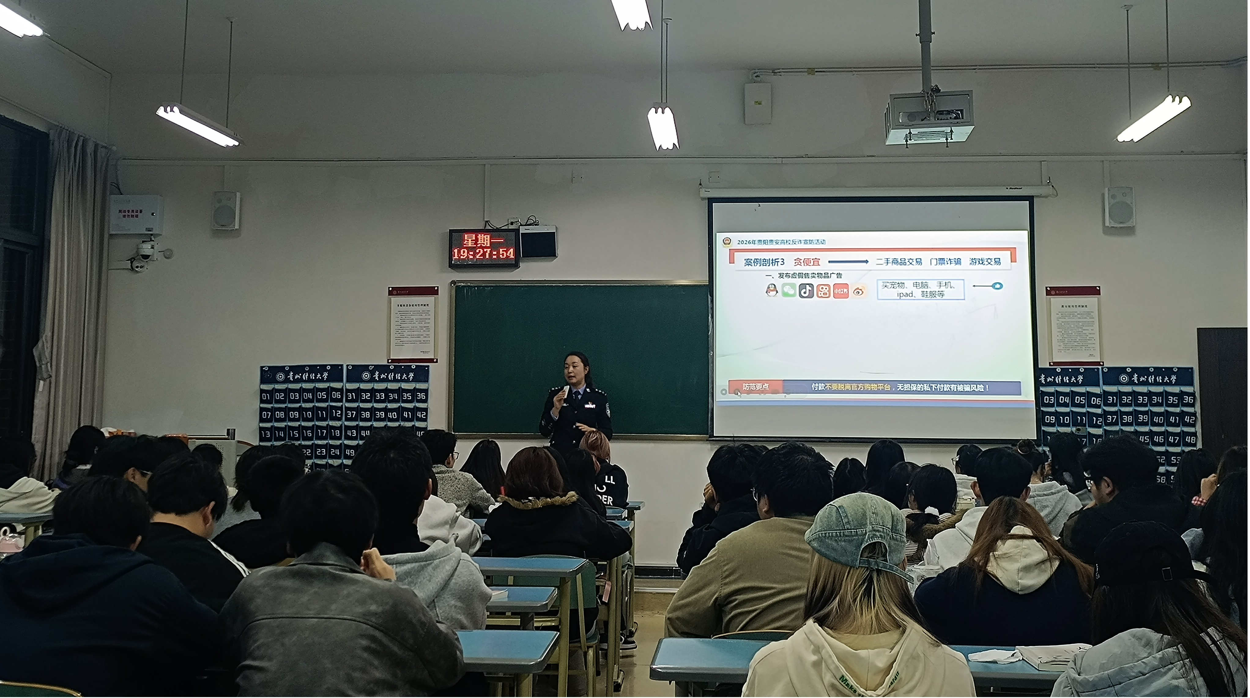 活动前期,党委保卫工作部精心统筹、周密部署,会同贵安新区公安局结合当前校园诈骗高发类型梳理宣讲内容,针对学生群体易遭遇的刷单返利、网络游戏产品虚假交易、虚假购物、虚假网上招聘、网络招嫖、冒充熟人等诈骗手段,精心制作宣讲课件,明确宣讲重点、细化宣讲流程,确保宣讲内容贴合学生实际、通俗易懂、具有针对性。
