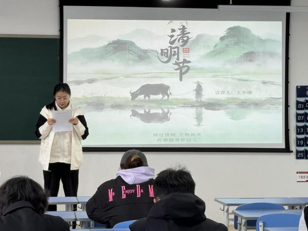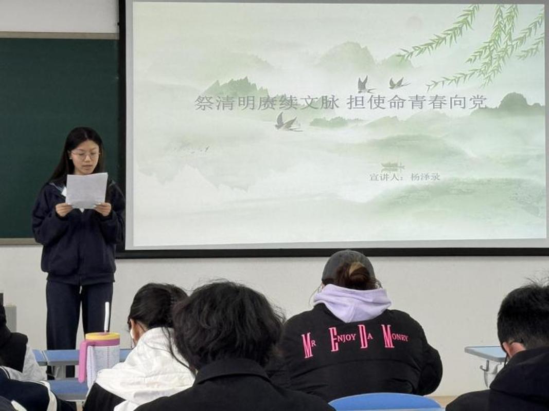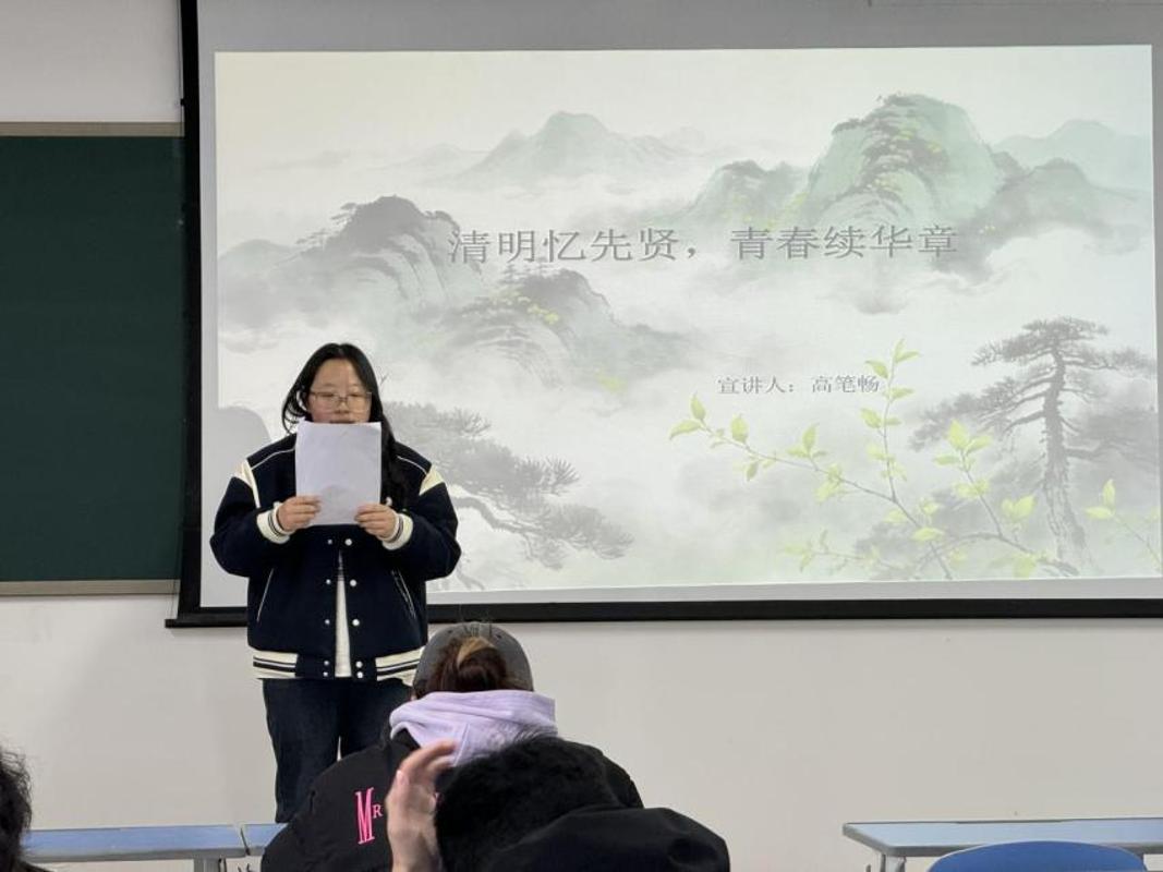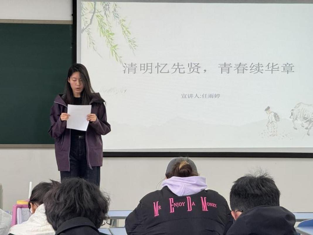 第二位同学从清明时节的节气意蕴切入,融合经典诗词品读与英烈事迹回顾,致敬先辈的赤诚与担当。分享既有对传统文化根脉的深情回望,也有对红色血脉的深刻体悟,激励同学们将缅怀之情转化为奋进力量,以实干书写青春答卷。