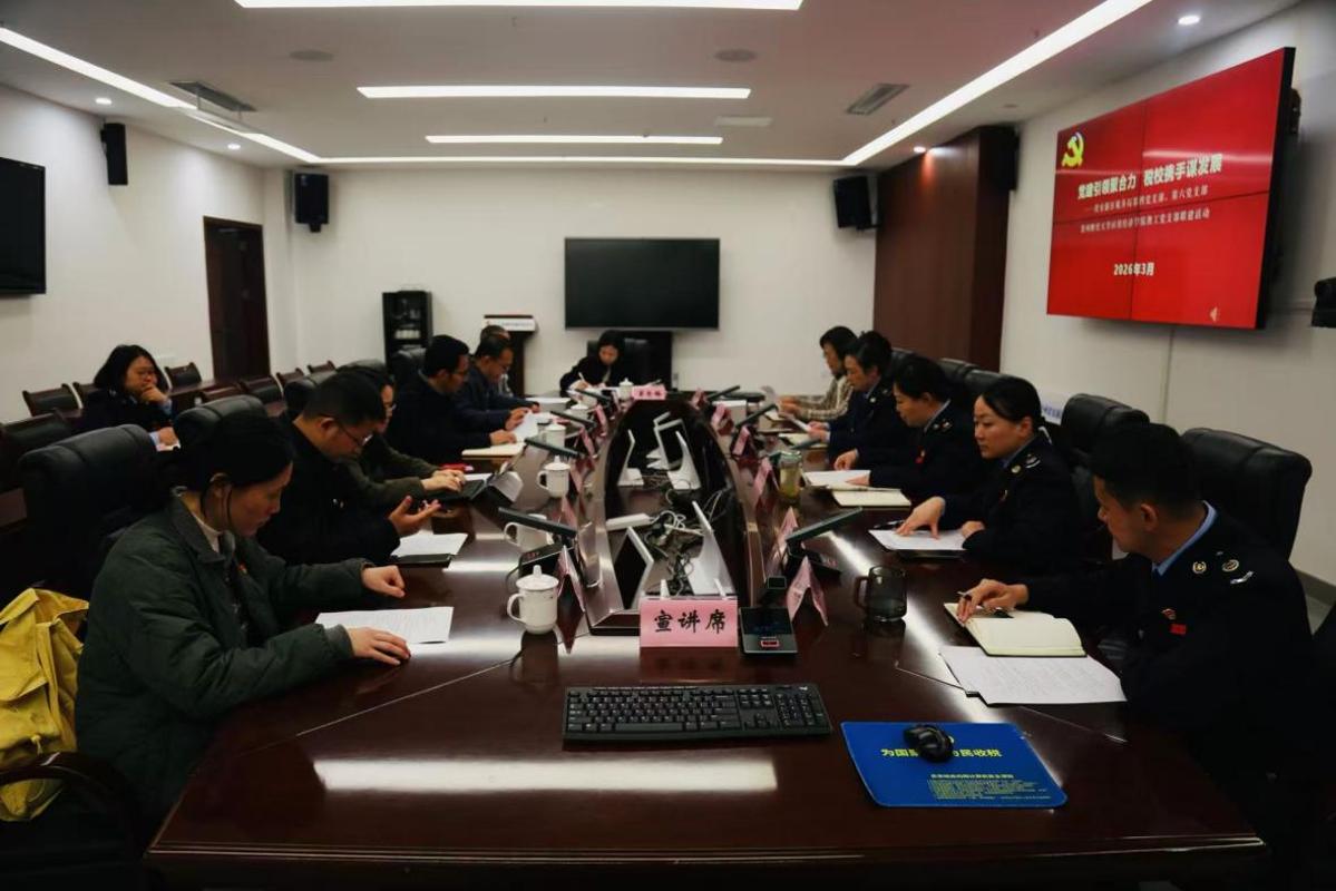 启动仪式结束后,应用经济学院财税系教工党支部党员代表与贵安新区税务局所属党支部,联合开展了题为“党建引领聚合力 校税携手谋发展”的支部联建活动。活动现场,贵安新区税务局党委书记、局长蒋春晖带领全体党员重温入党誓词,共同感悟初心使命、凝聚奋进力量。随后,全体人员深入学习了习近平总书记关于牢牢把握雄安新区功能定位、努力建设新时代创新高地和推动高质量发展样板的重要讲话精神,重点研读了《习近平关于树立和践行正确政绩观论述摘编》中“坚持高质量发展要成为领导干部政绩观的重要内容”等核心要义。通过学习研讨,大家进一步统一思想、提高认识,深刻领会到,正确的政绩观就是要立足本职岗位,真抓实干、勇于担当,言必信、行必果,以实际行动践行对历史和人民的责任。