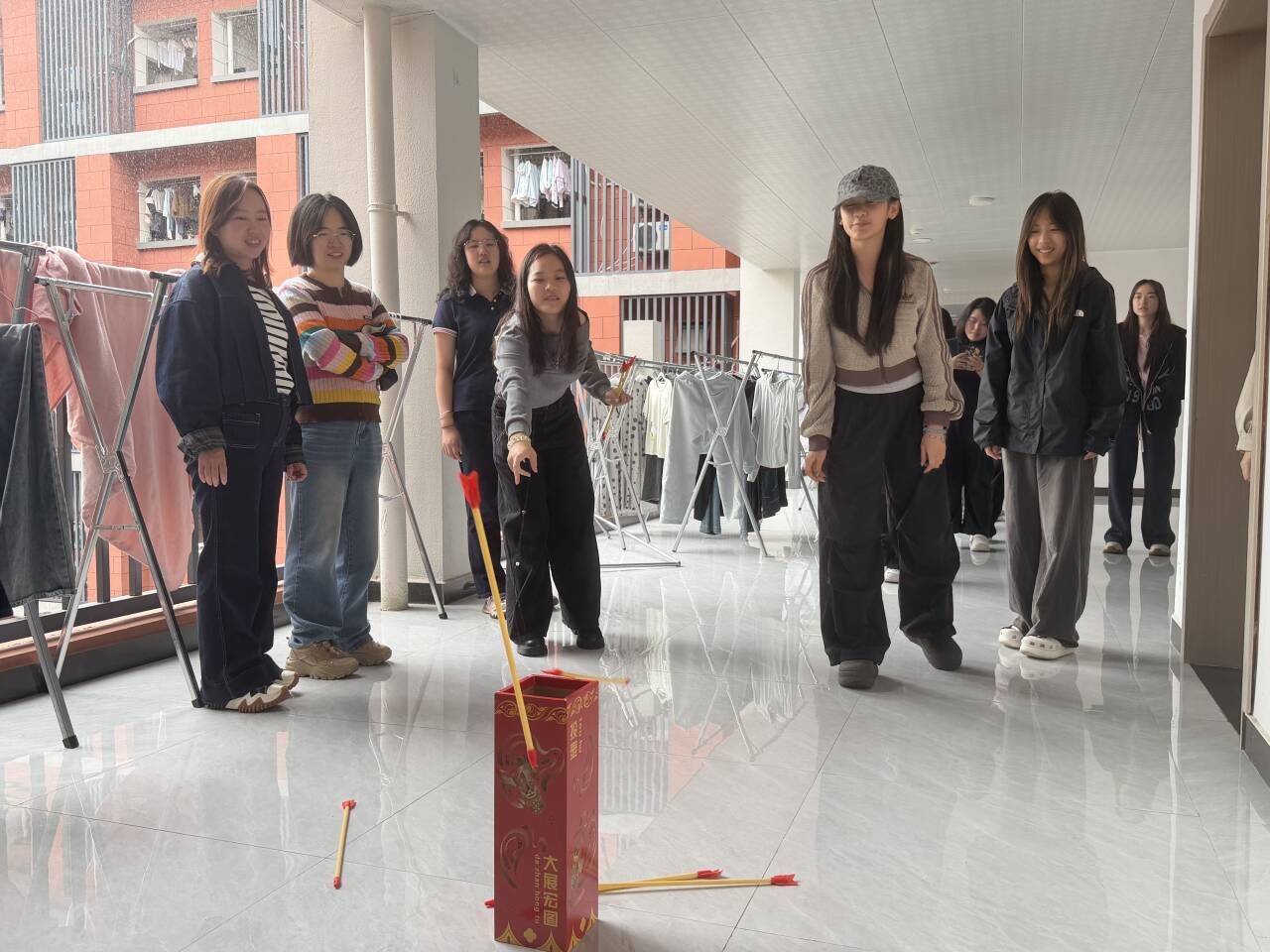 “心理趣味运动会”——投壶。作为传统解压趣味项目,以轻松的互动形式舒缓身心。同学们有序排队参与投掷,凝神瞄准、专注发力,在欢声笑语的互动中放松心情、释放压力,有效卸下日常学习与生活的疲惫。
