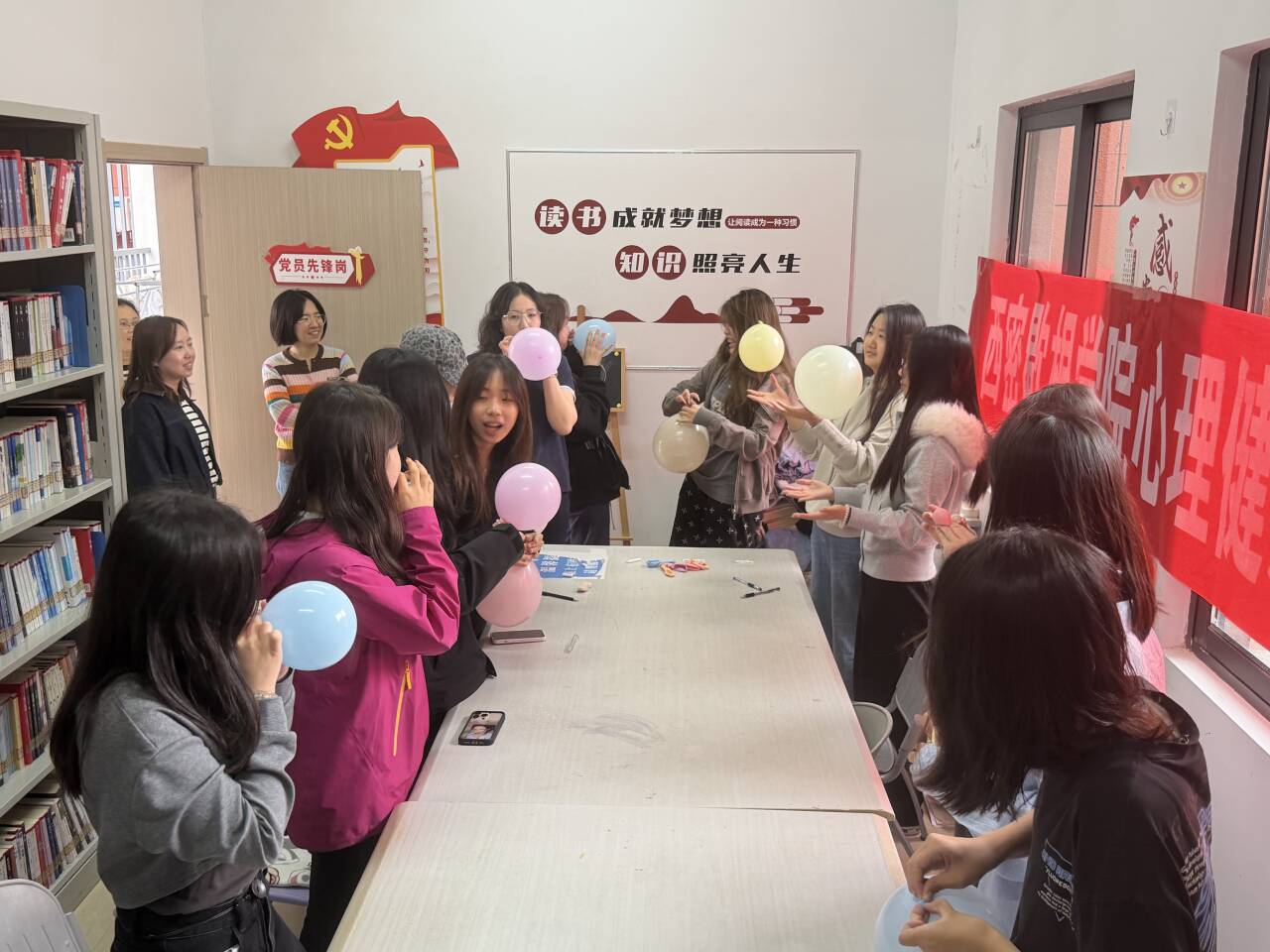 “激发你的肺活量”——解压吹气球。同学们通过吹气球的趣味互动释放负面情绪,沉浸式感受轻松愉悦的氛围,以趣味方式完成心理解压。